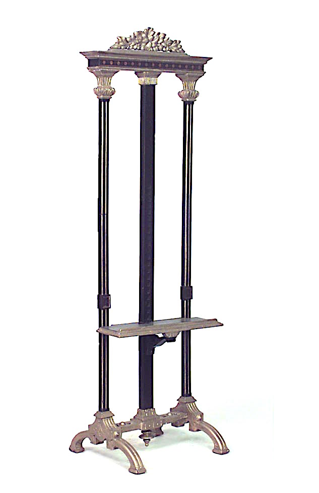 American Victorian painted black and gilt trimmed easel stand with inlaid and floral carved top (att: Herter Brothers).