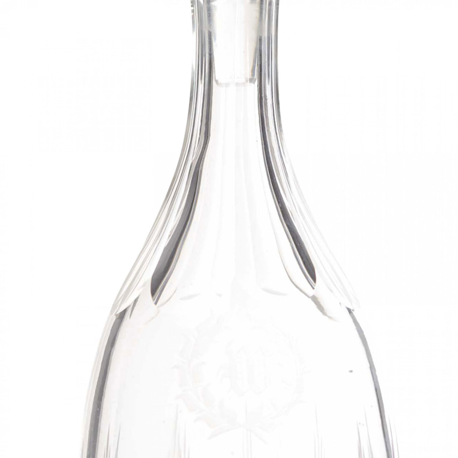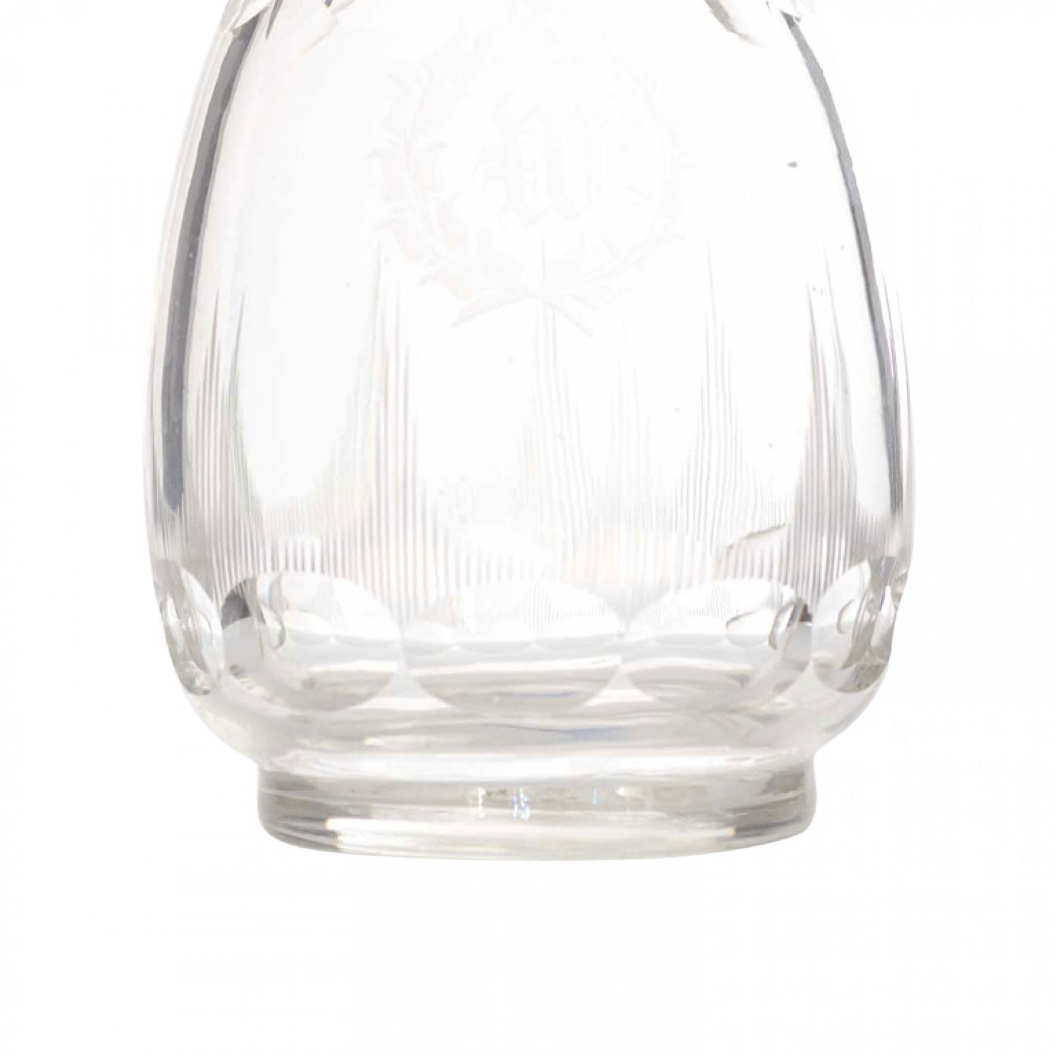 American Victorian-style vintage glass decanter with fluting that begins above the center narrowing to the neck having an etched "W" in a wreath with a cut glass stopper..