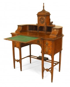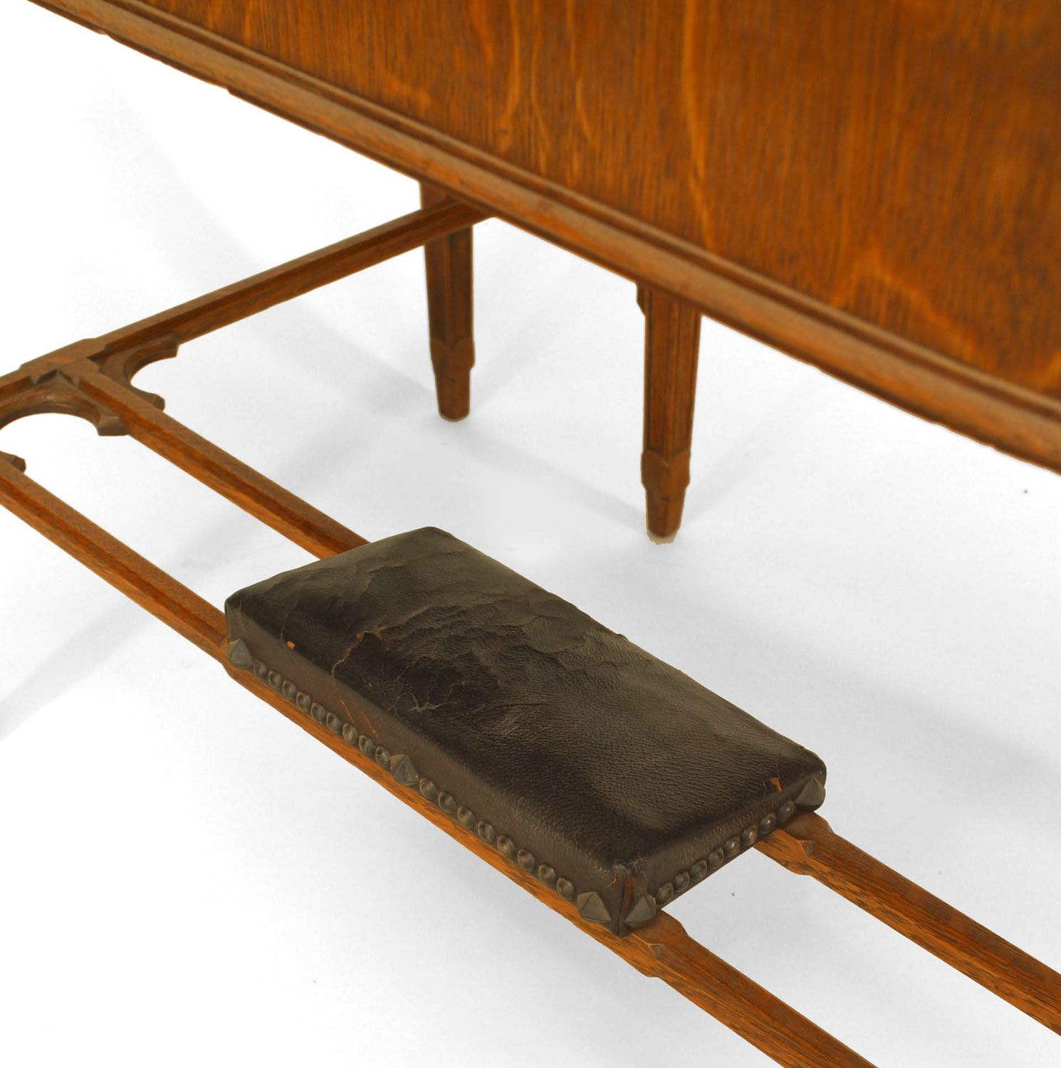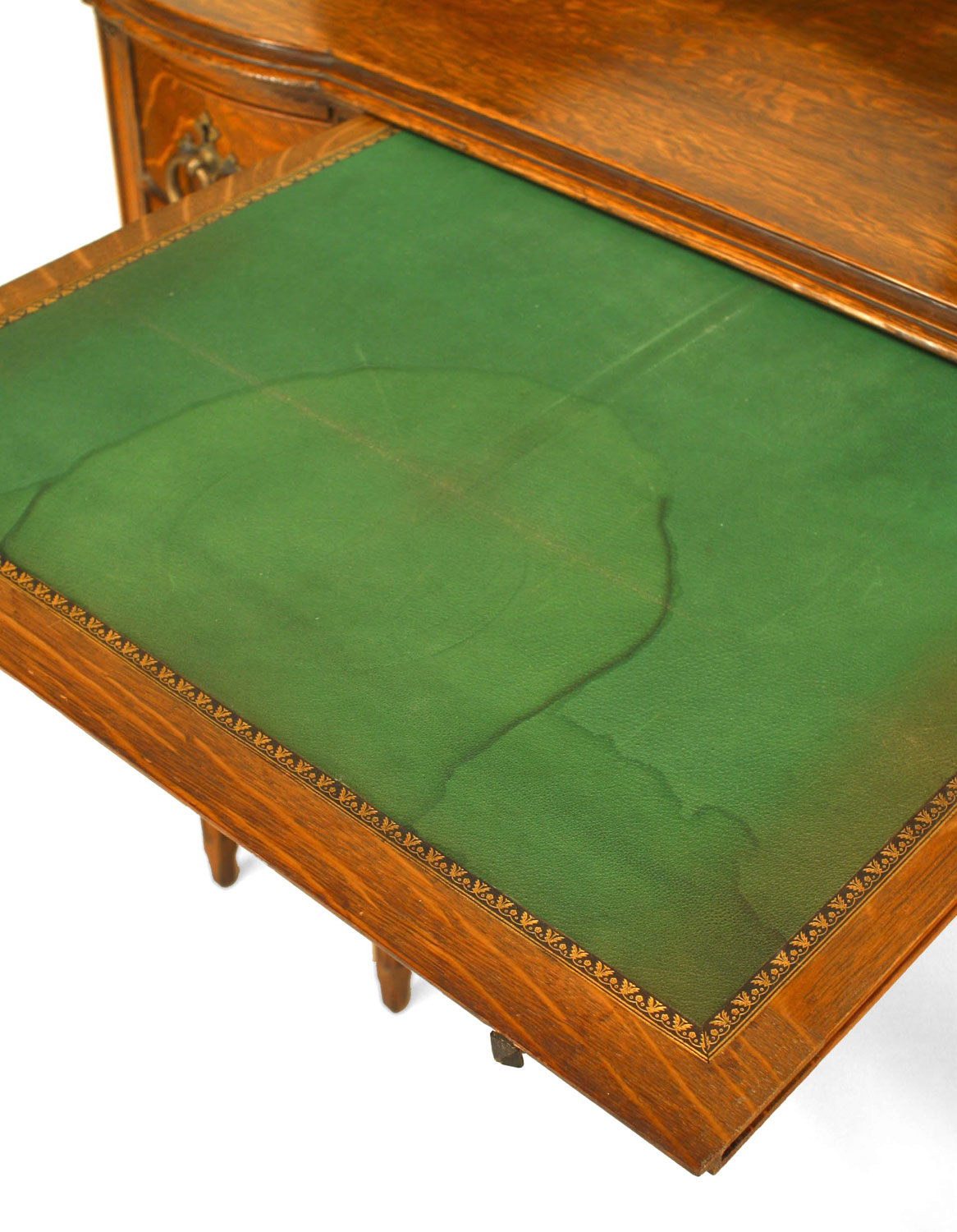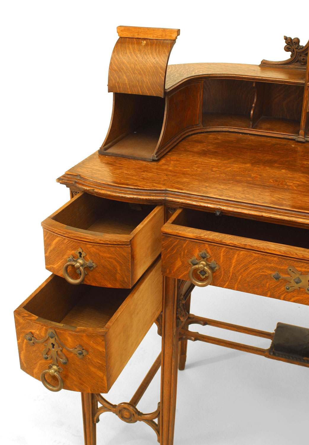 American Victorian Gothic Revival (mid-19th Century) oak "Carlton House" desk with super structure above drawers on legs joined by stretchers.