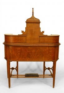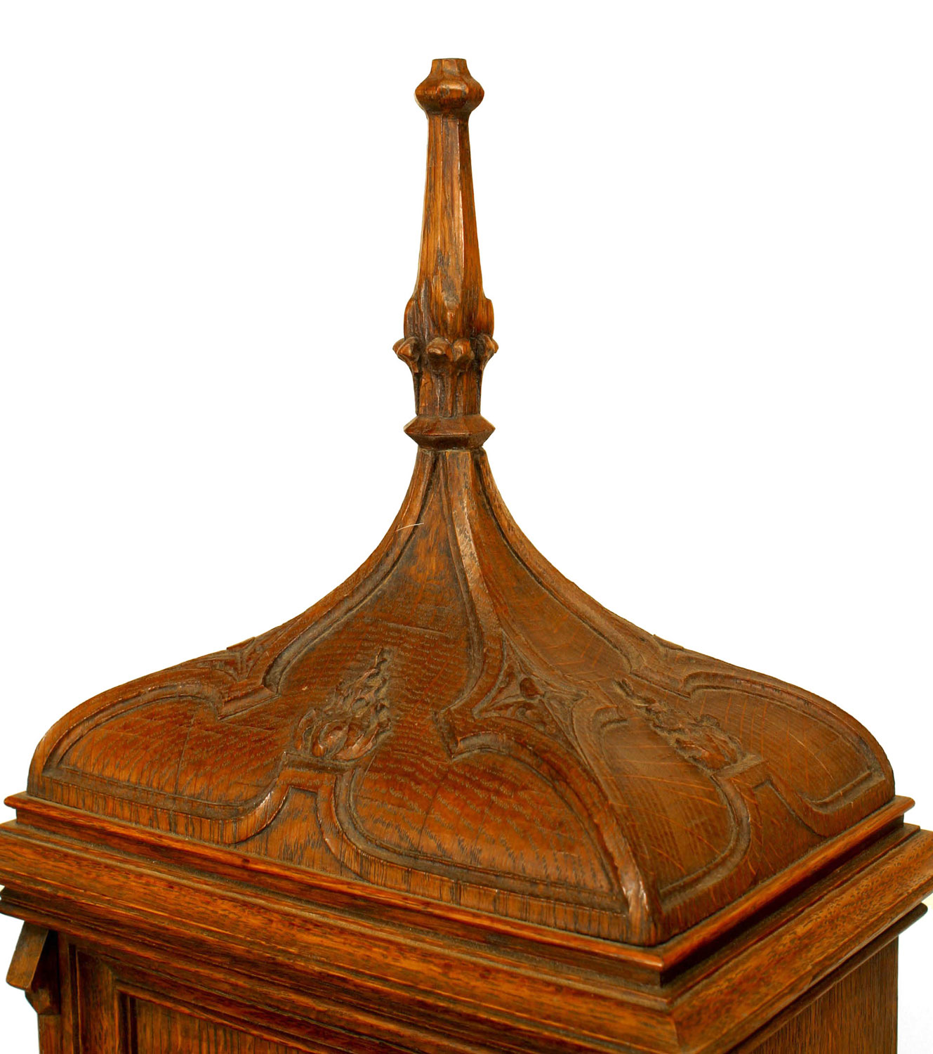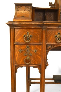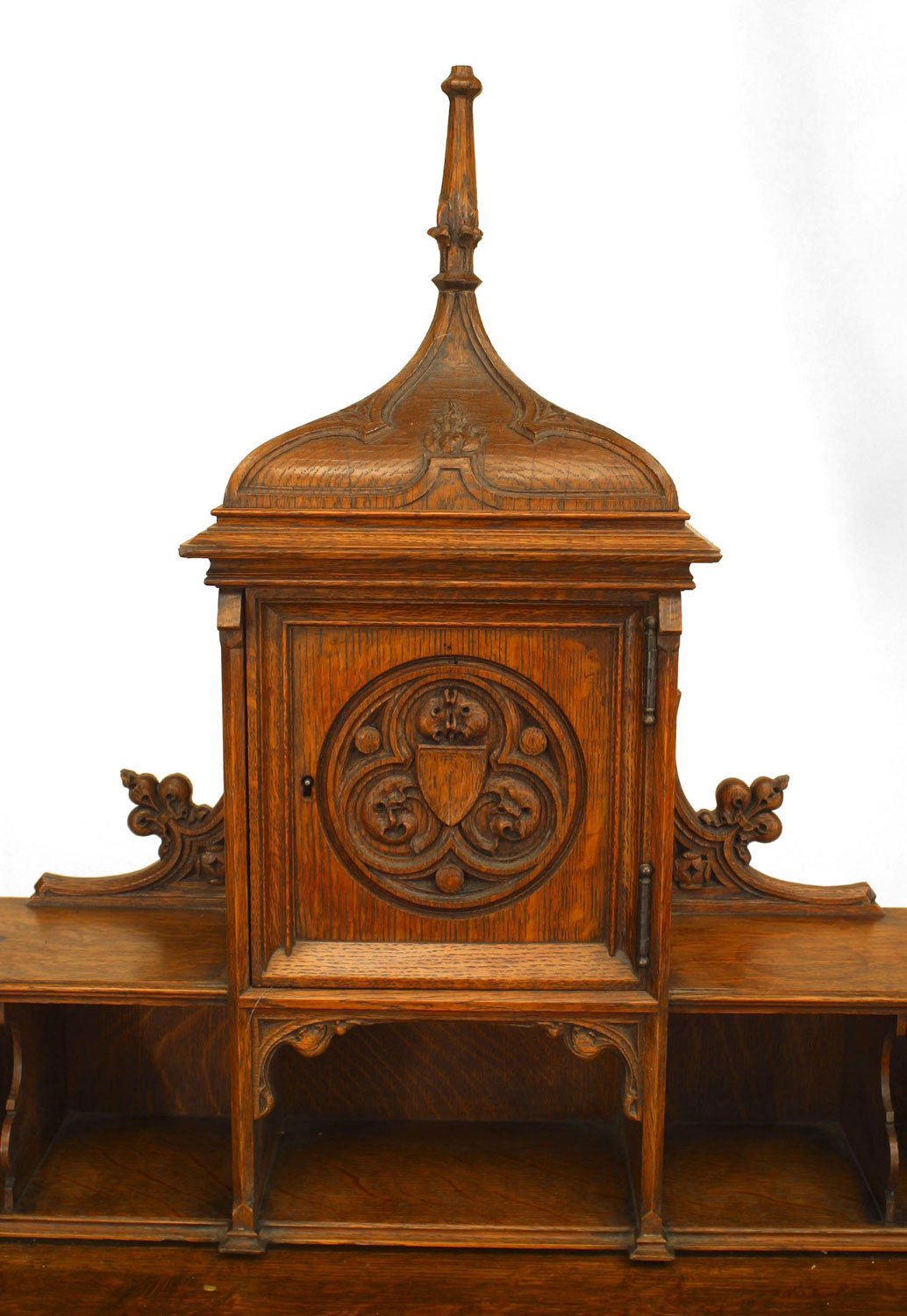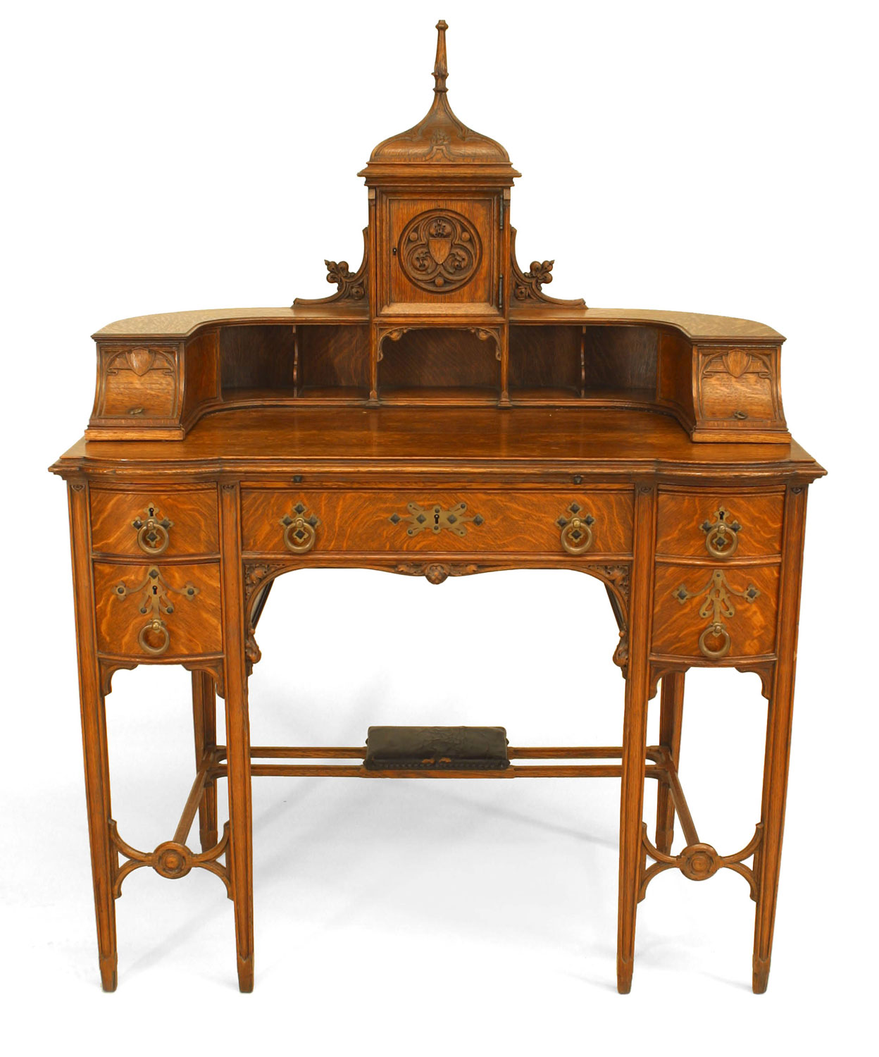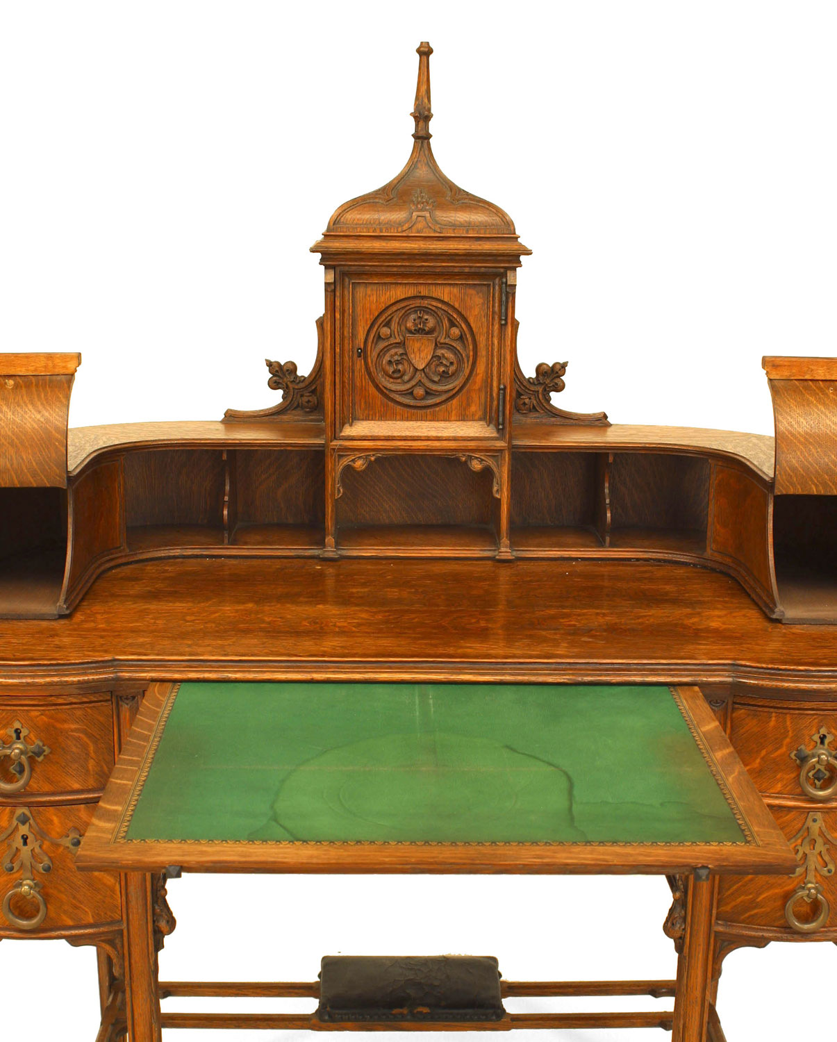 American Victorian Gothic Revival (mid-19th Century) oak "Carlton House" desk with super structure above drawers on legs joined by stretchers..