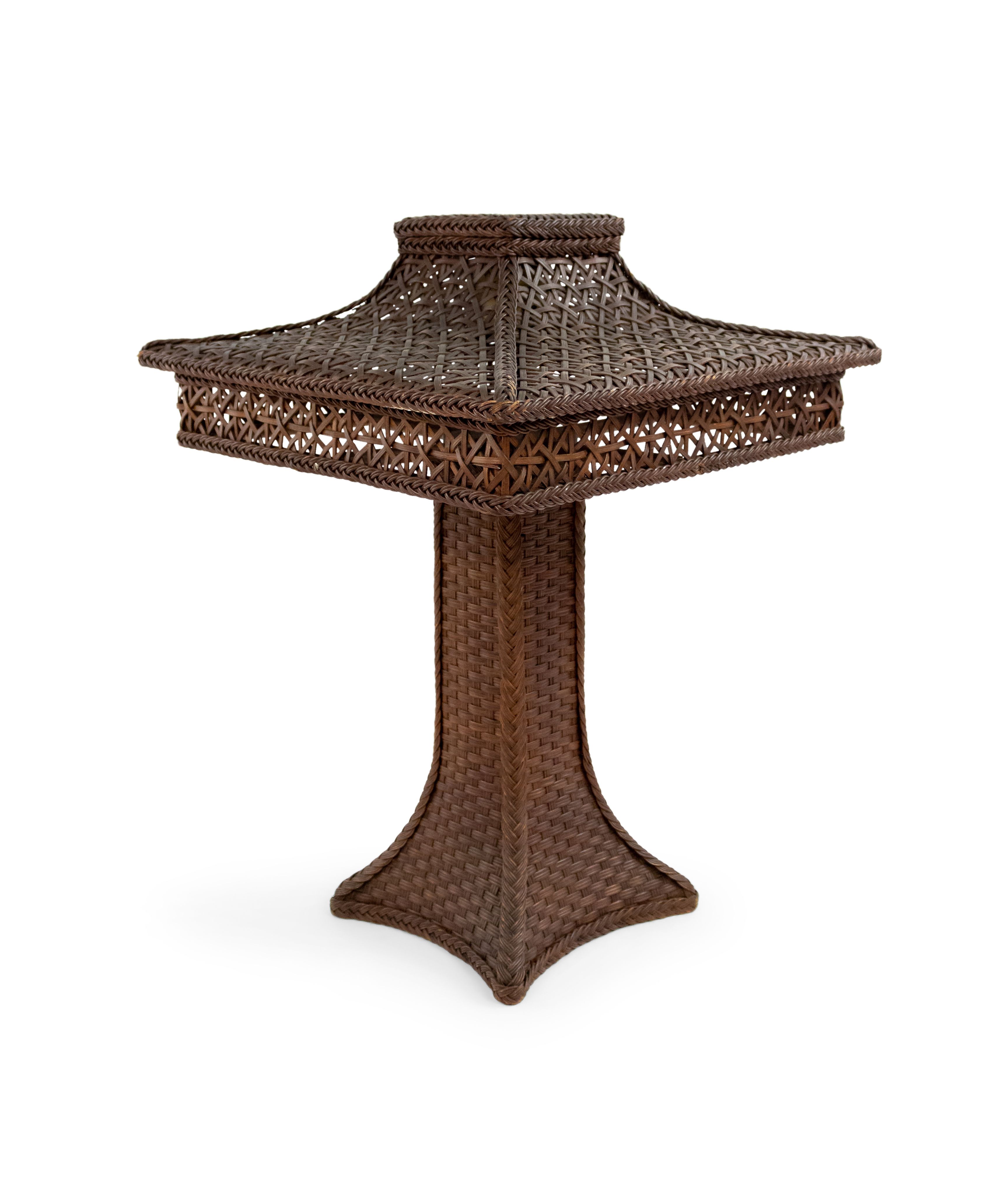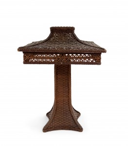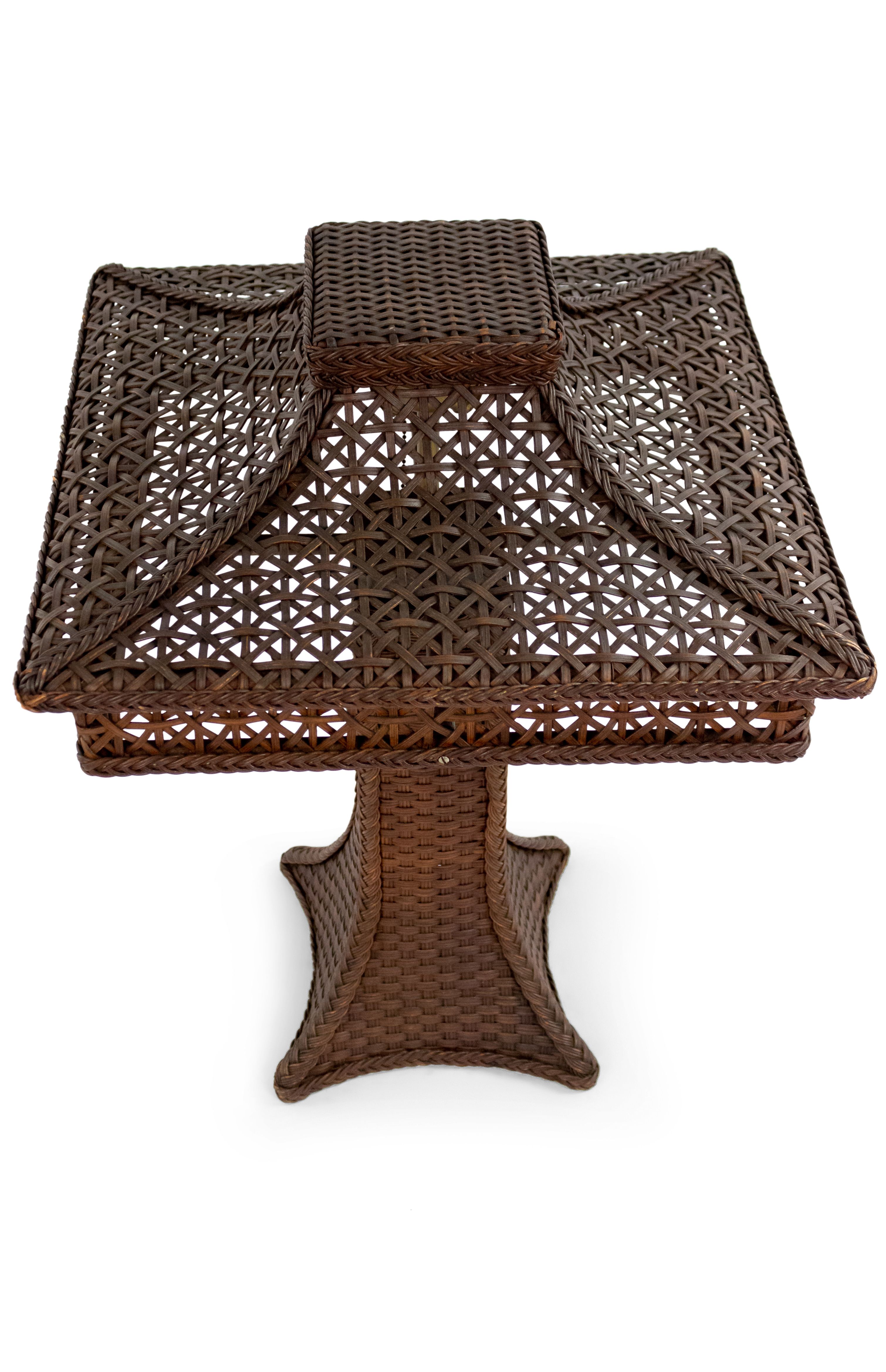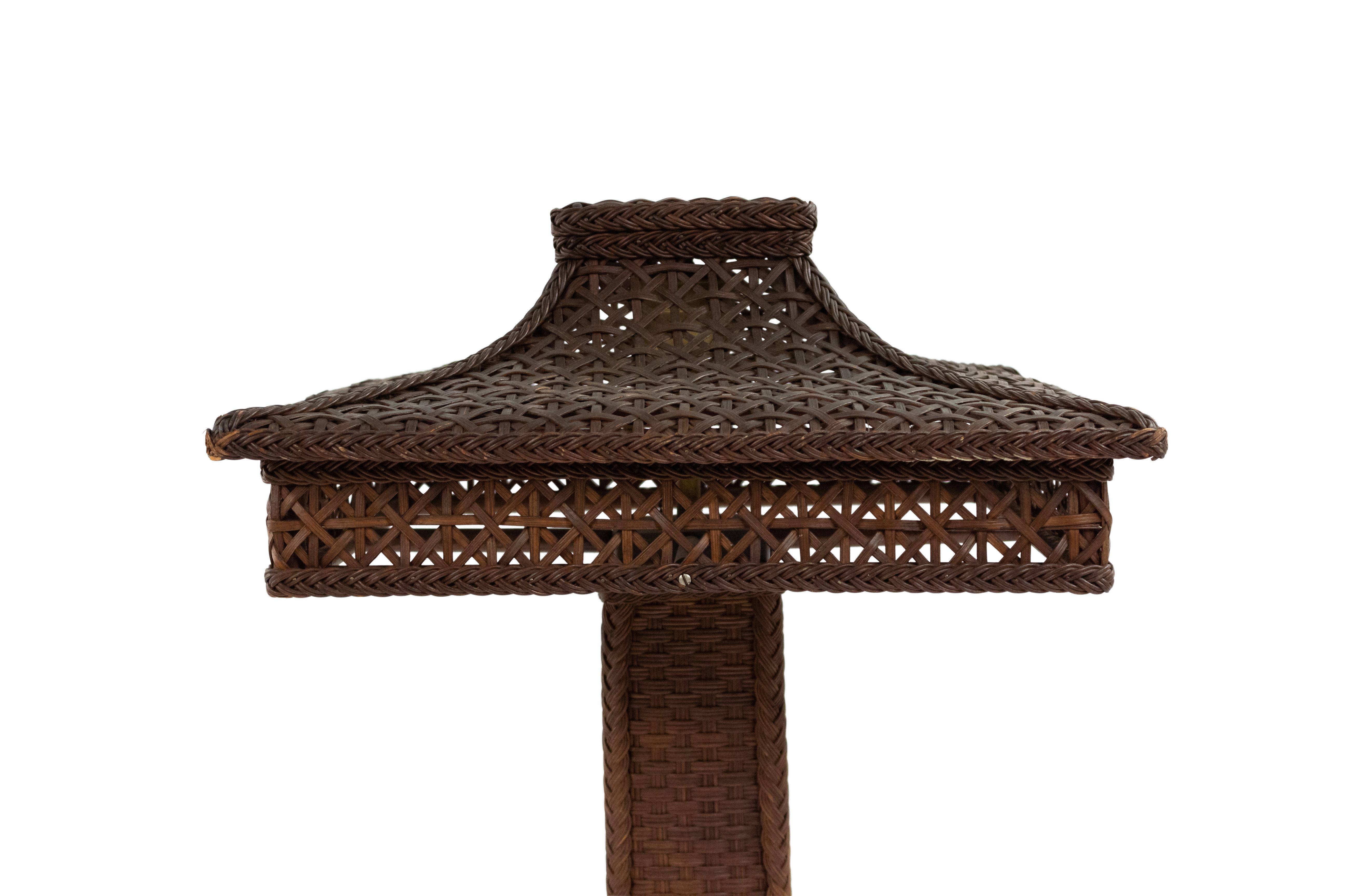 American Victorian natural wicker large table lamp with a square filigree woven shade resting on a square woven base (HEYWOOD BROS WAKEFIELD label).