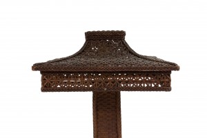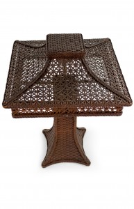 American Victorian natural wicker large table lamp with a square filigree woven shade resting on a square woven base (HEYWOOD BROS WAKEFIELD label)