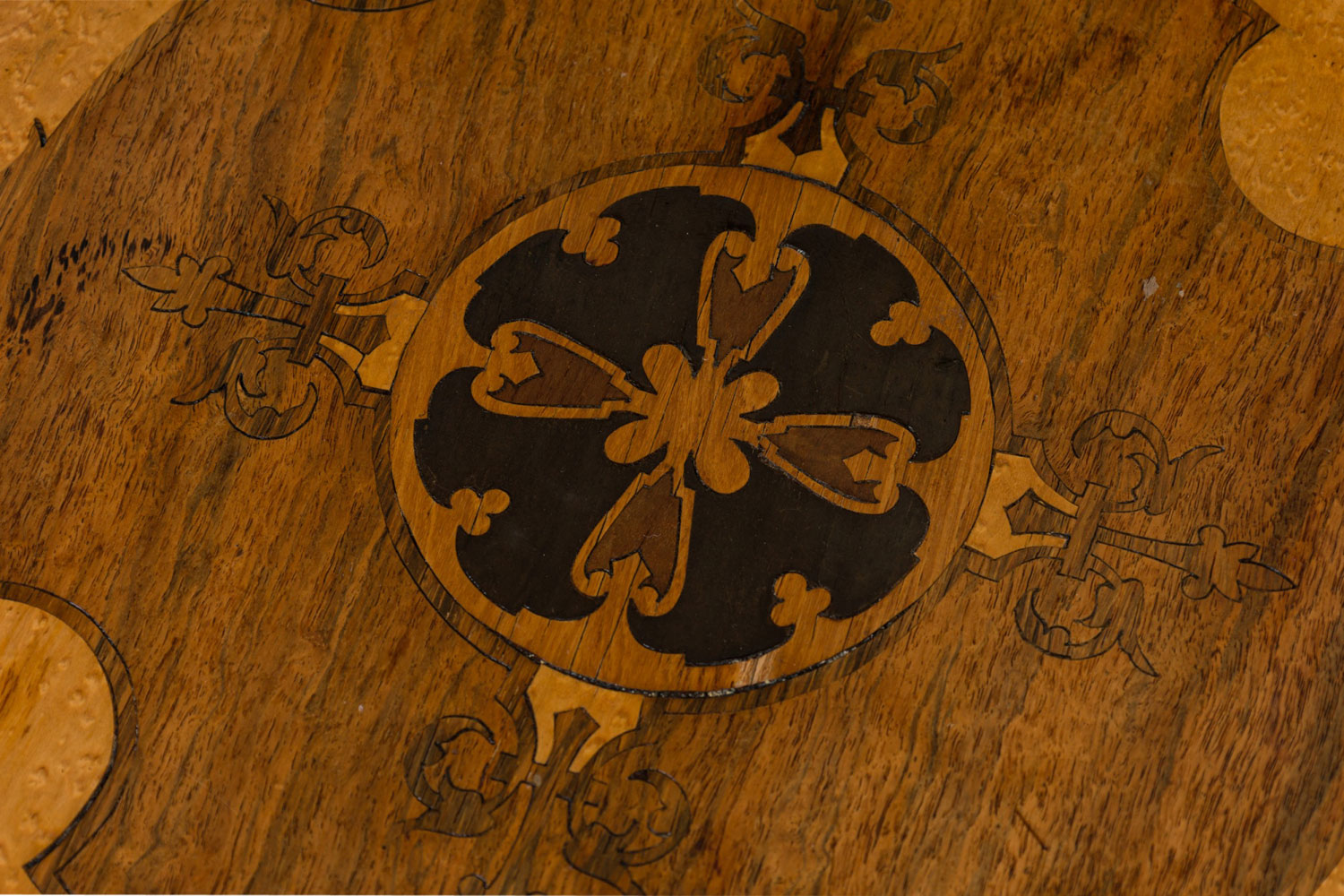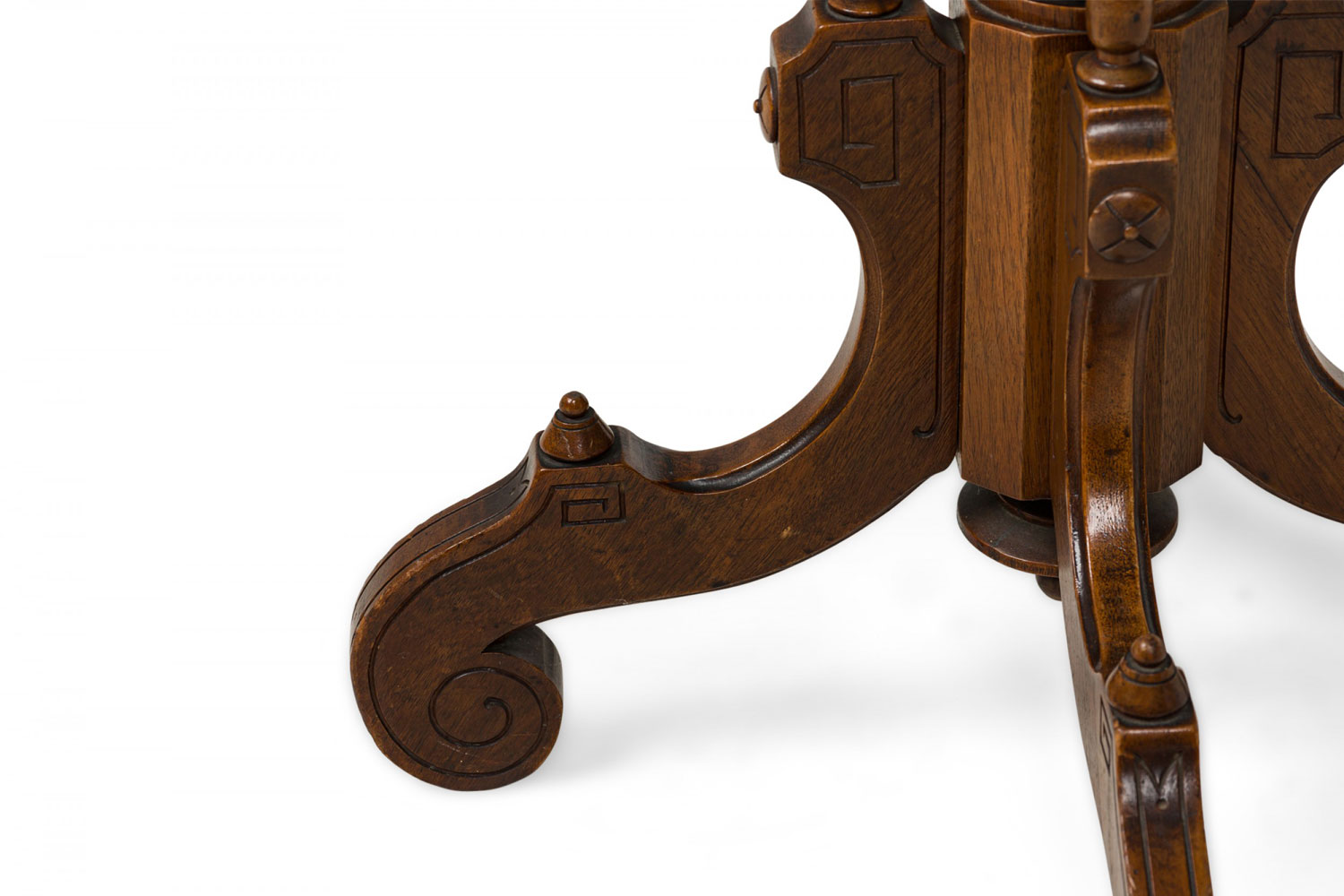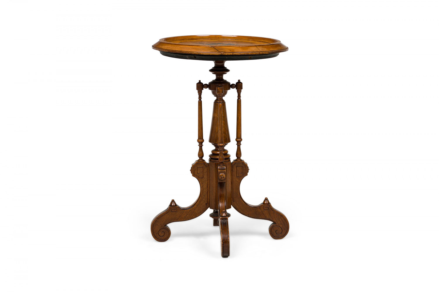 American Victorian walnut plant stand / side table with circular top featuring a central inlaid medallion design, resting on a pedestal base with a central turned post, ending in 4 perpendicular flattened carved legs with scroll feet.