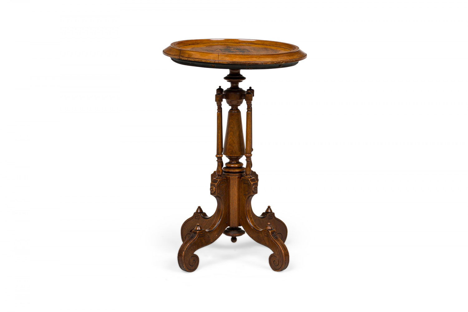American Victorian walnut plant stand / side table with circular top featuring a central inlaid medallion design, resting on a pedestal base with a central turned post, ending in 4 perpendicular flattened carved legs with scroll feet..