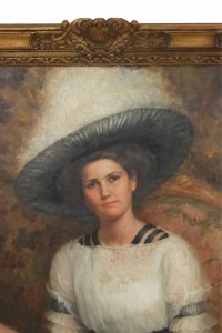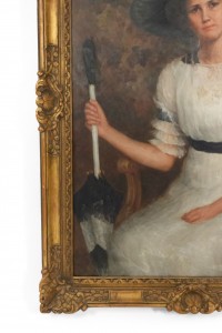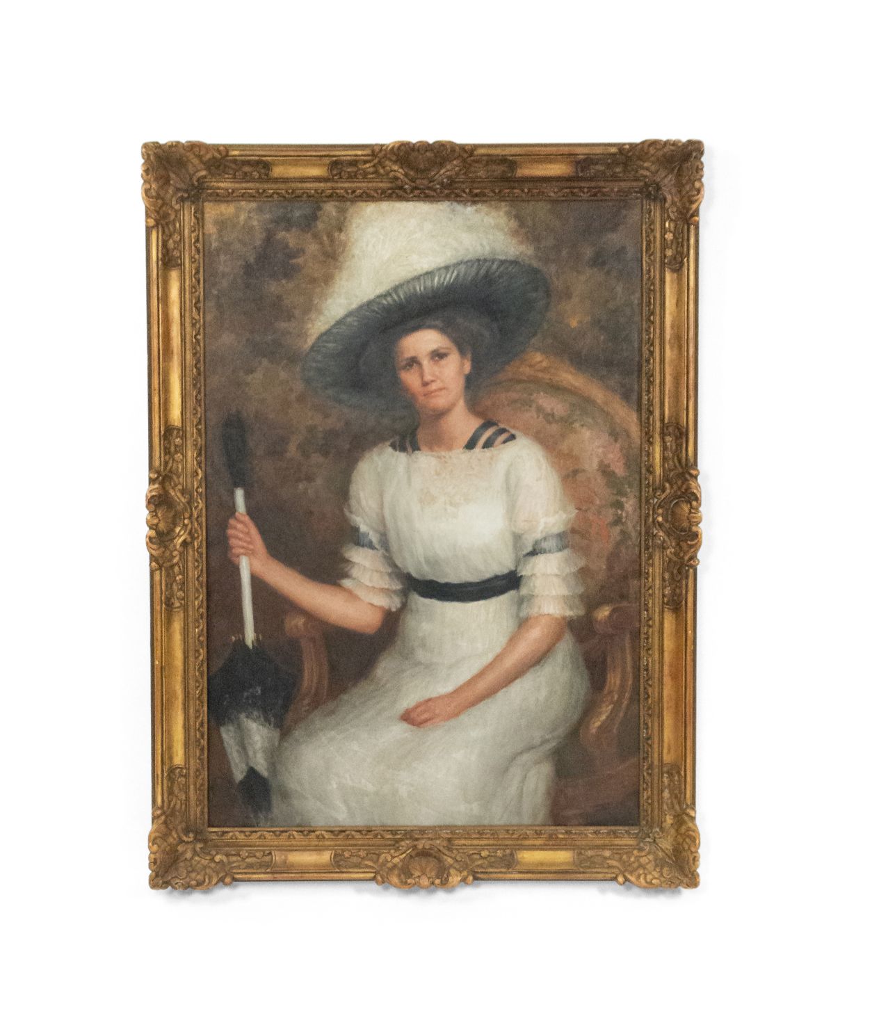 American Victorian oil on canvas painting portrait depicting a seated lady in white dress & hat with umbrella within a gilt frame (signed by: CD(CATHERINE DENKMANN) WENTWORTH 1865-1948)