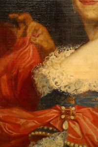American Victorian ebonized framed oil portrait, painting of 19th Century lady in blue and red dress.