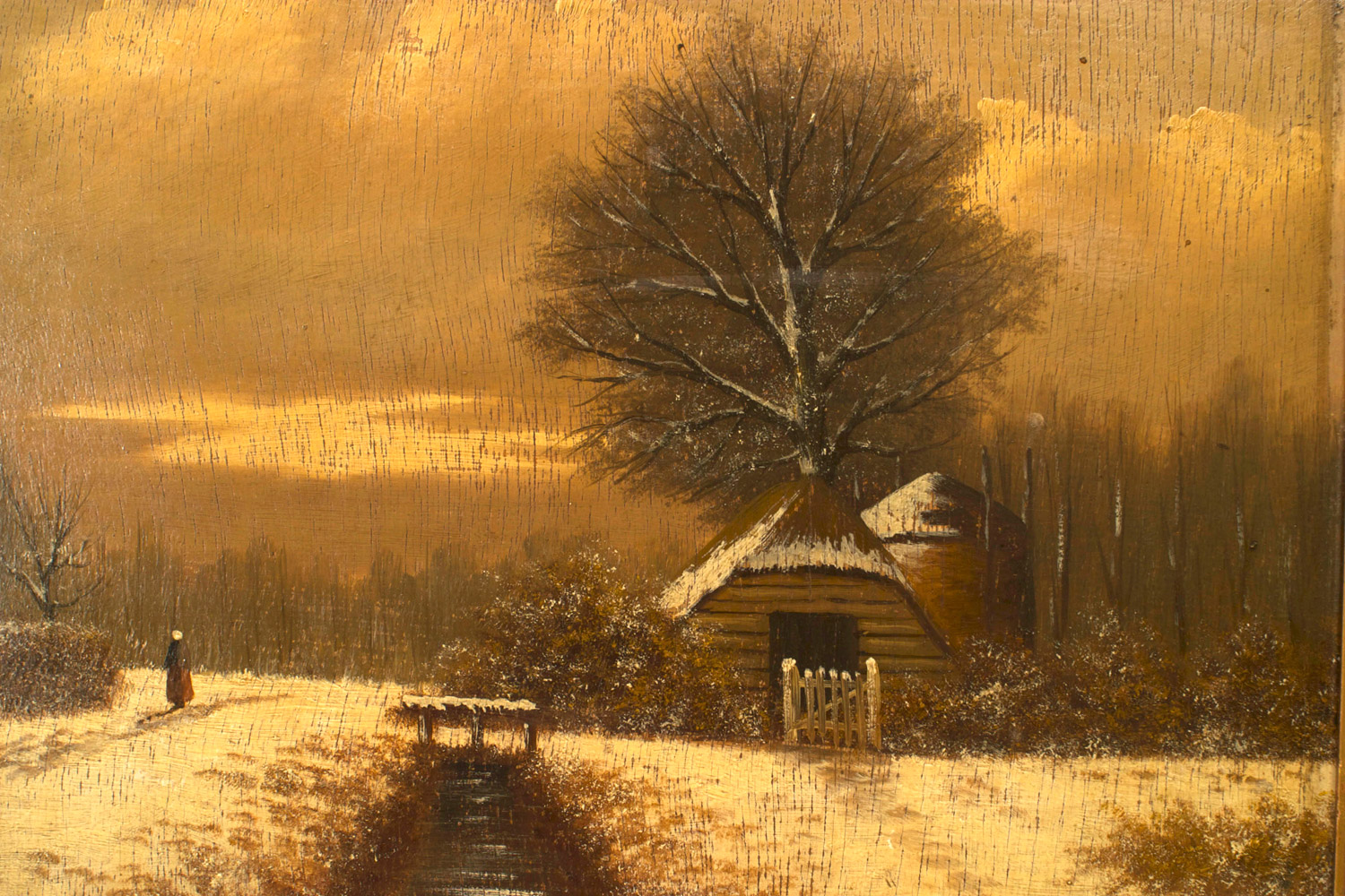 American Victorian style (20th Cent) old framed oil painting on board of landscape with stream and house with snow on ground..