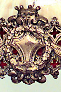 American Victorian leaded amber and red glass chandelier shade with bronze filigree swag design rim.