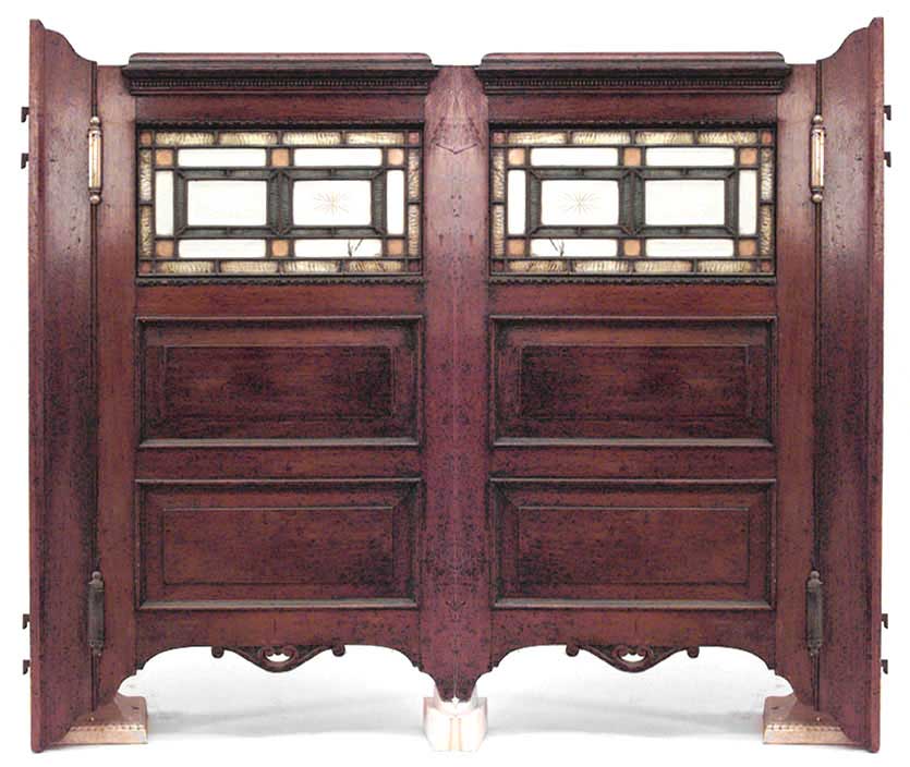 PAIR of American Victorian mahogany swinging bar doors with leaded and colored glass panels (PRICED AS PAIR).