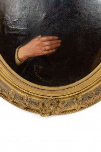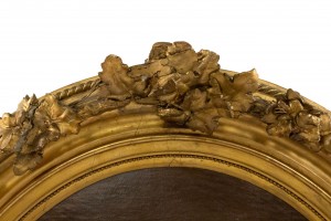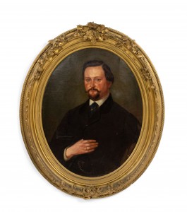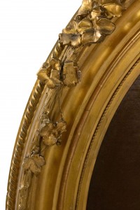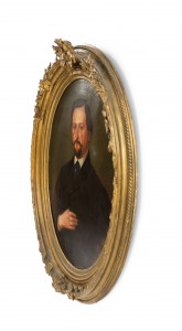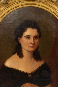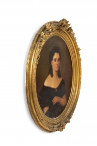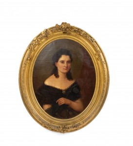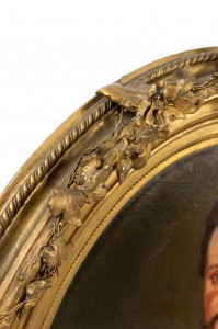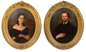 PAIR of American Victorian style gilt framed oval oil painting portraits of man with mustache and lady in black lace