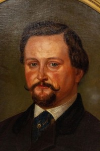 PAIR of American Victorian style gilt framed oval oil painting portraits of man with mustache and lady in black lace.