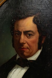 American Victorian gilt framed oval oil portrait painting of man with black tie.