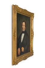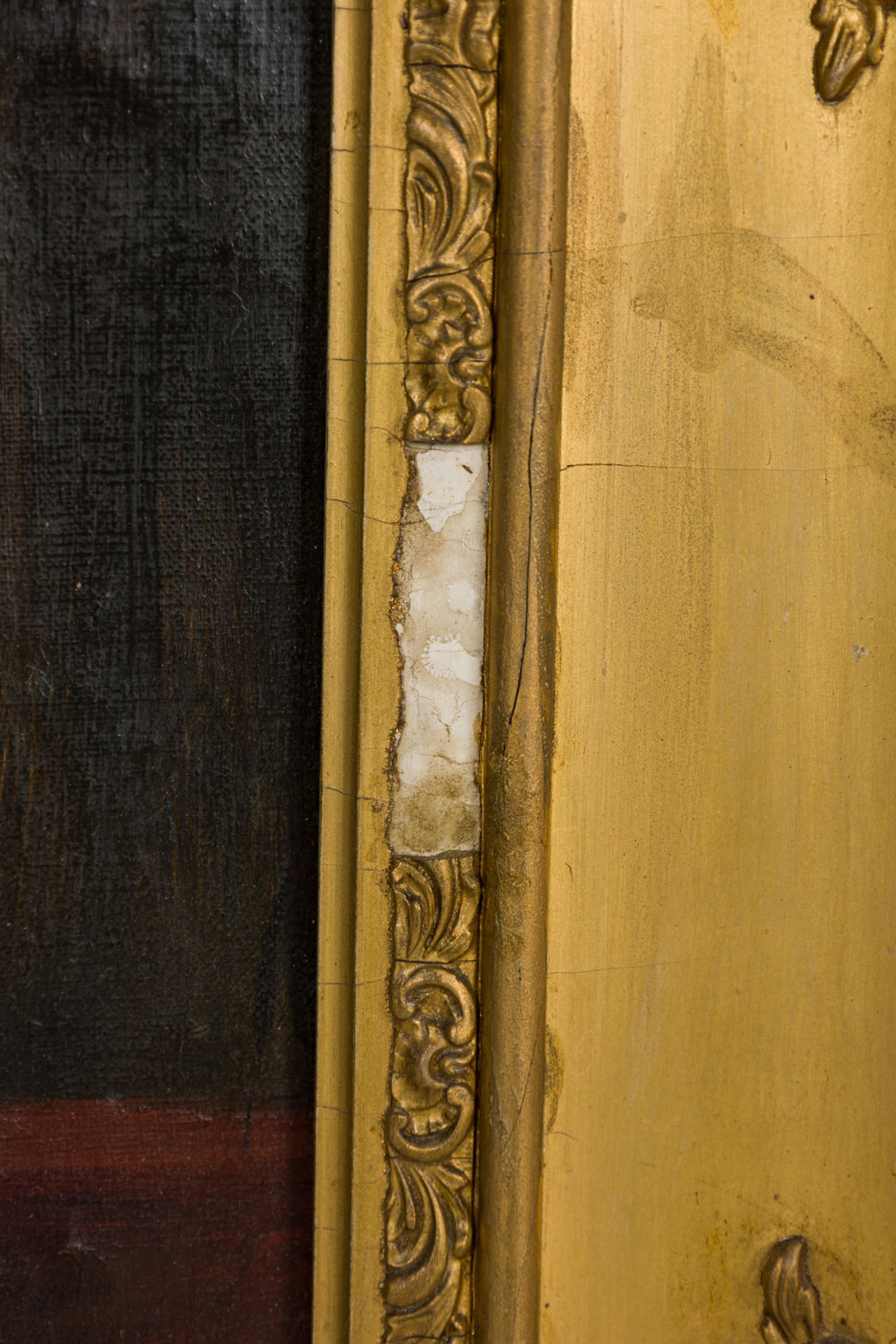 American Victorian gilt framed oil painting portrait of 19th Century man with stick pin and white shirt