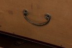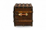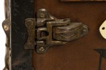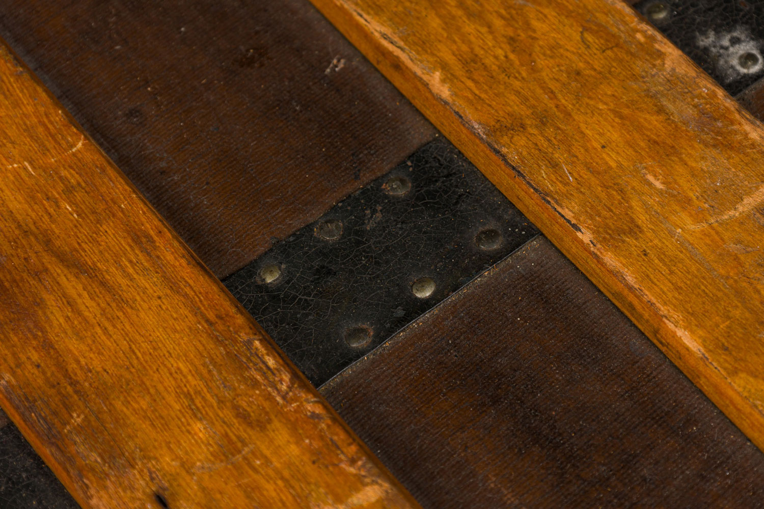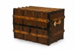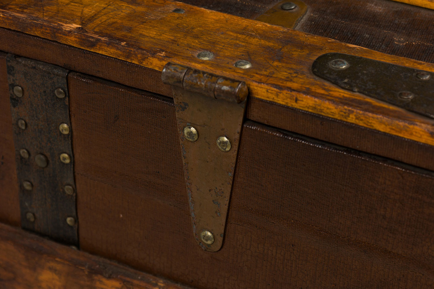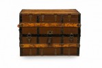 Style: English Materials & Techniques: Brass, iron, leather, metal, wood Category: Cabinets & Case Goods, Bedroom, Accessories/Décor/Bric-a-Brac Condition: Exterior handles not original. One has fallen off. Good; Minor losses