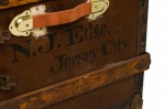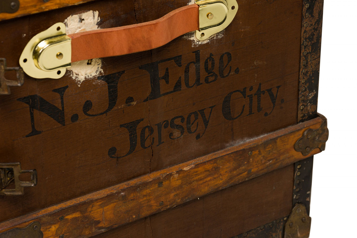American Victorian (late 1800s) steamer trunk with a brown leather exterior with brass closures and rivets with 5 interior drawers and a leather handle on either side (name on side "N.J. Edge, Jersey City")
