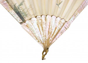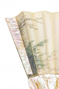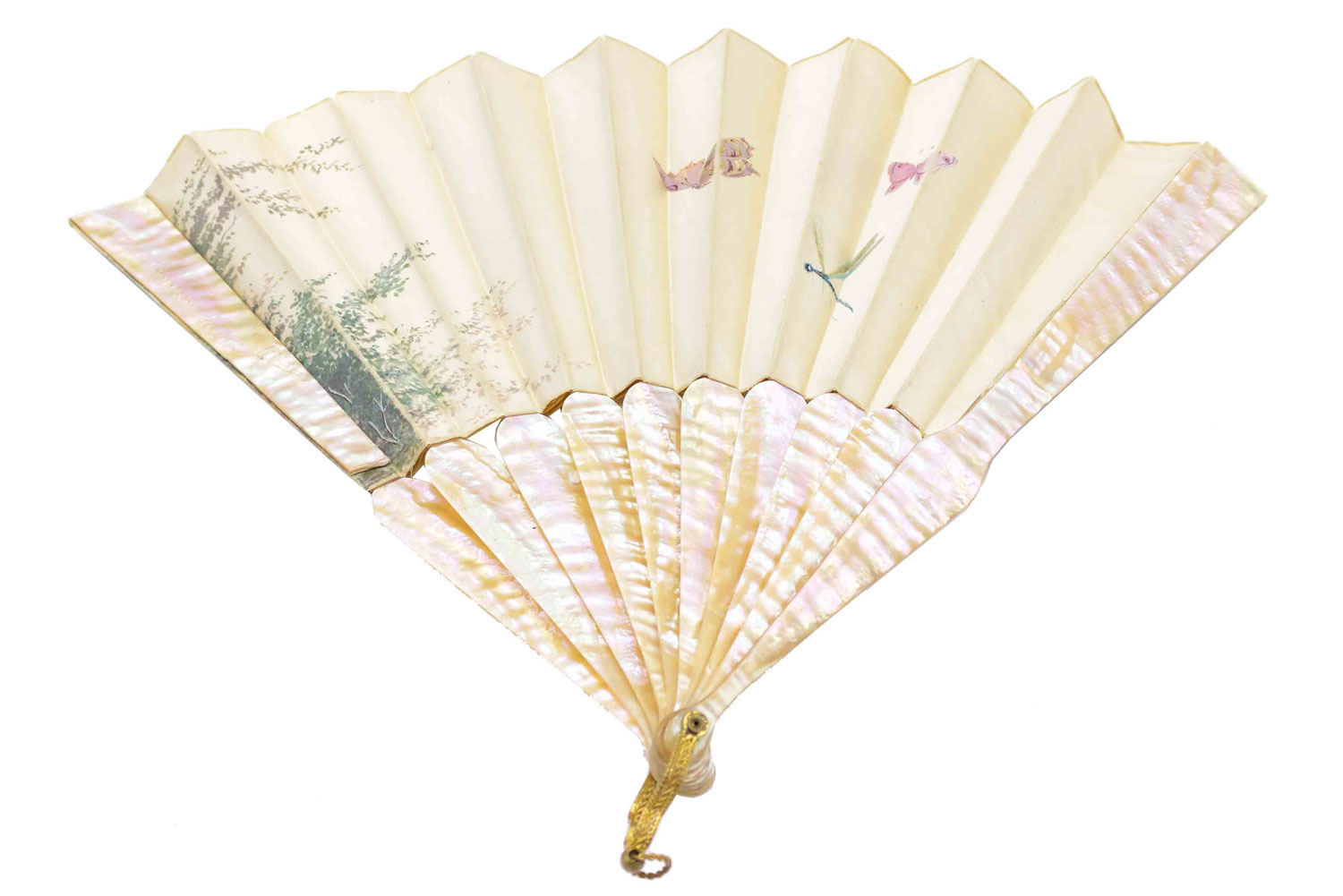 American Victorian decorative hand fan with mother of pearl and silk painted scene.