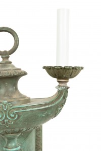 American Victorian bronze (with green patina) wall sconce with a two-light Aladdin lamp design, finial bottom, and ring top..