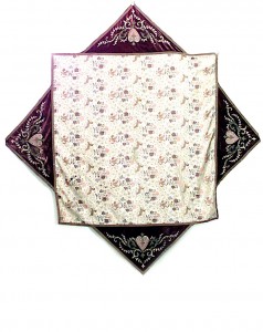 American Victorian purple velvet 8 sided embroidered edge table cover with beige floral and animal center.