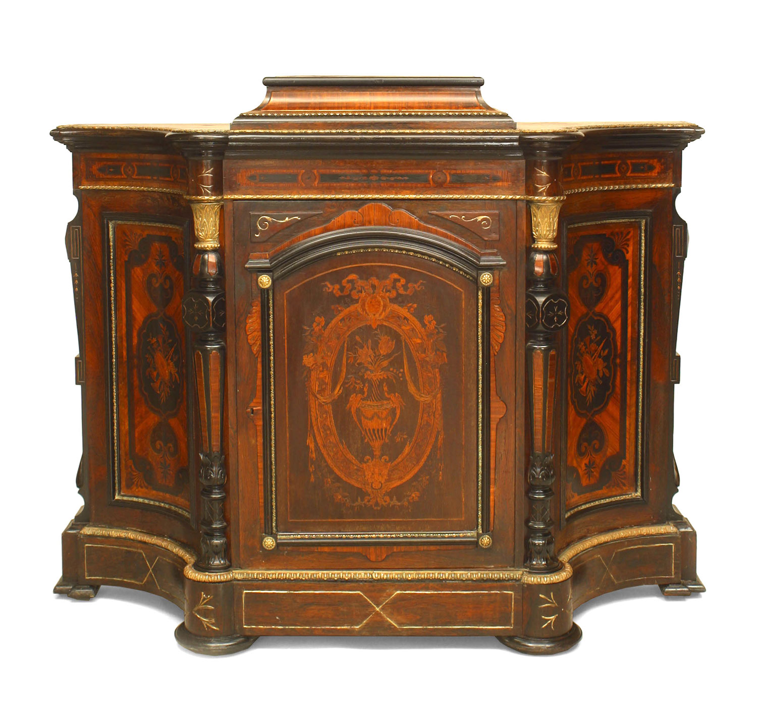 American Victorian Eastlake (NY) rosewood credenza with bronze & ebonized trim. Having a raised center platform over concave inlaid side panels and a front door maple interior. (Missing bronze trim on side)