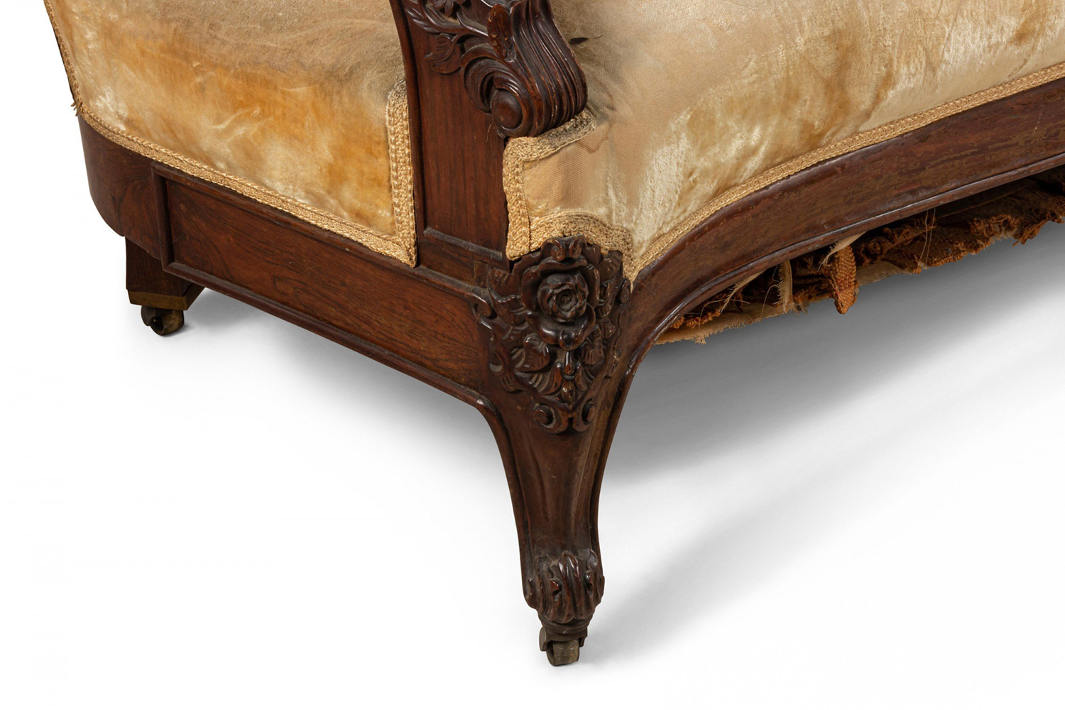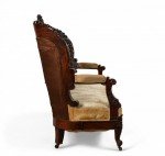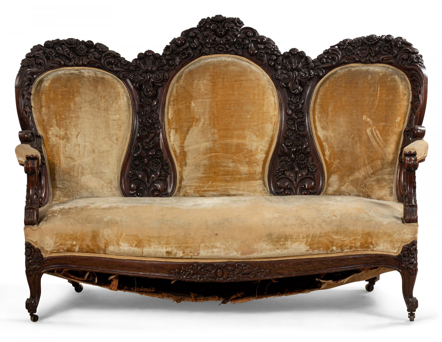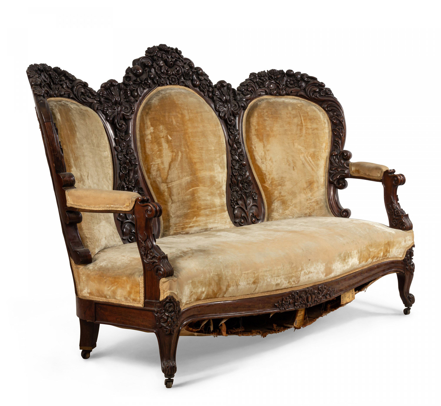 Style: American Materials & Techniques: Wood, rosewood, carved Category: Seating Condition: Minor stains to upholstery. Seat structure in antique condition.