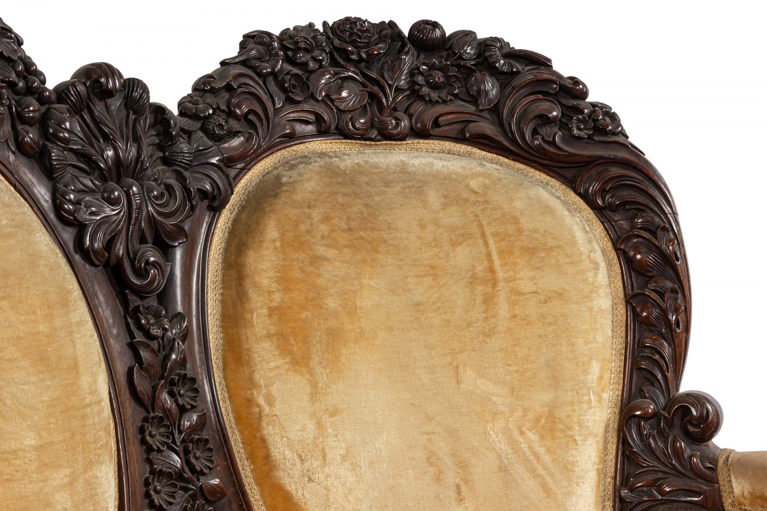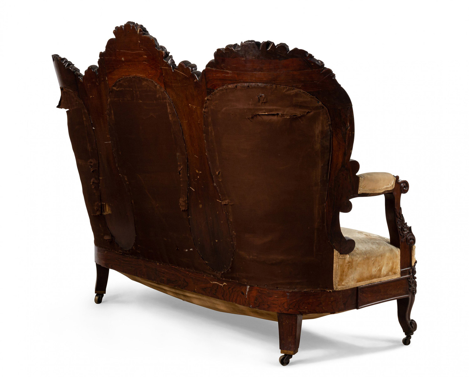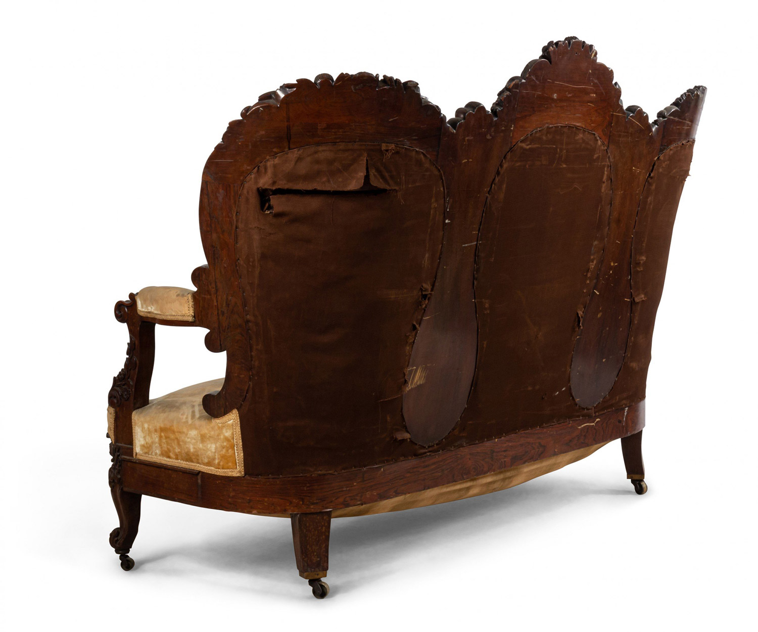 American Victorian carved triple oval back rosewood settee with beige upholstery..