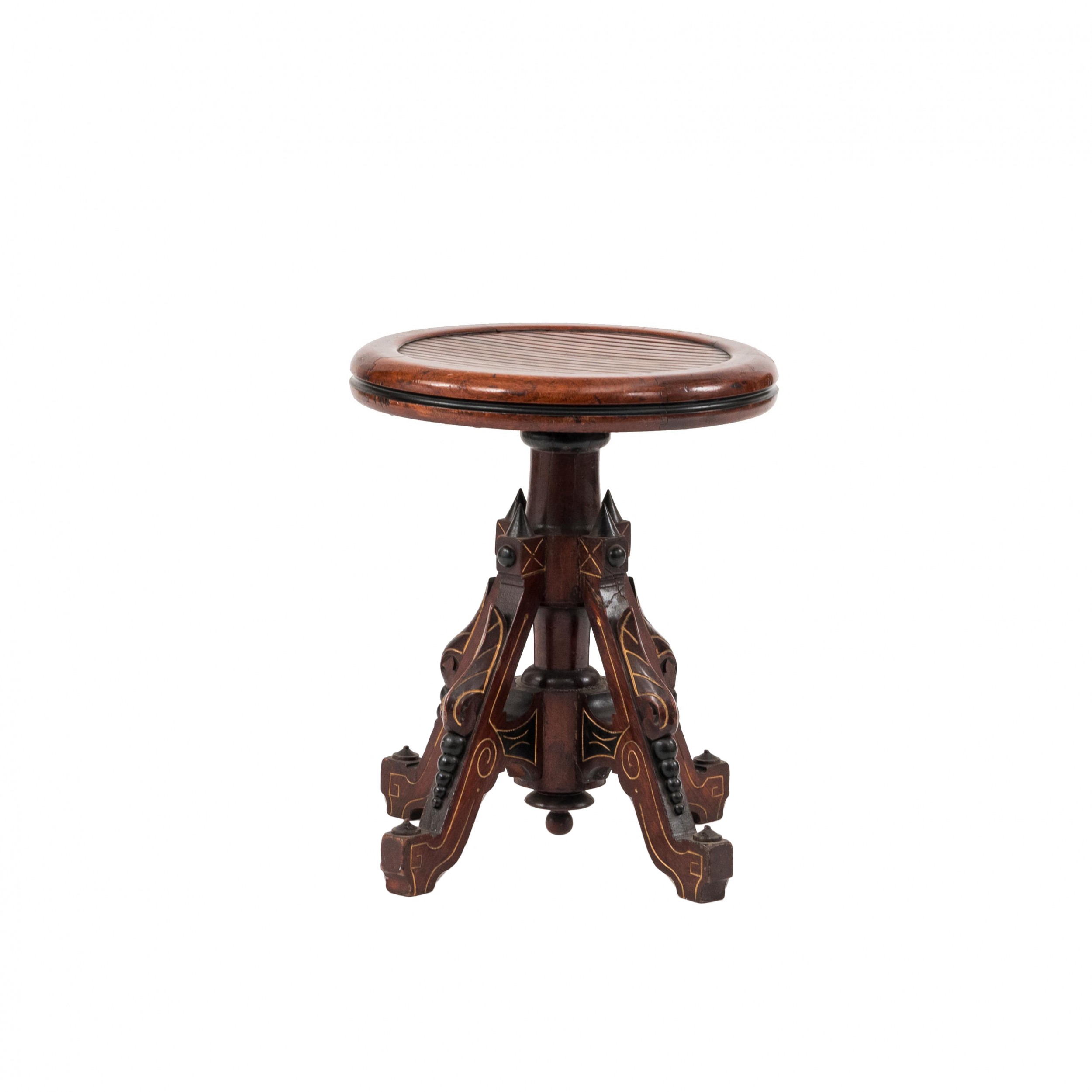 American Victorian Eastlake style (circa 1865) rosewood swivel stool with round slat top and ebonized and gilt trim.