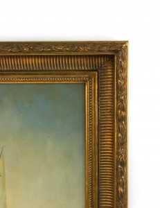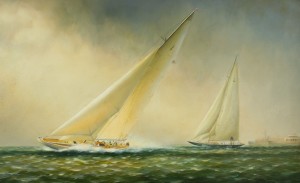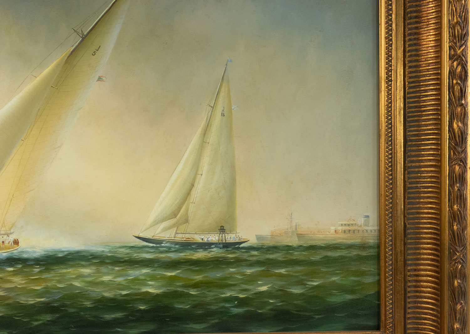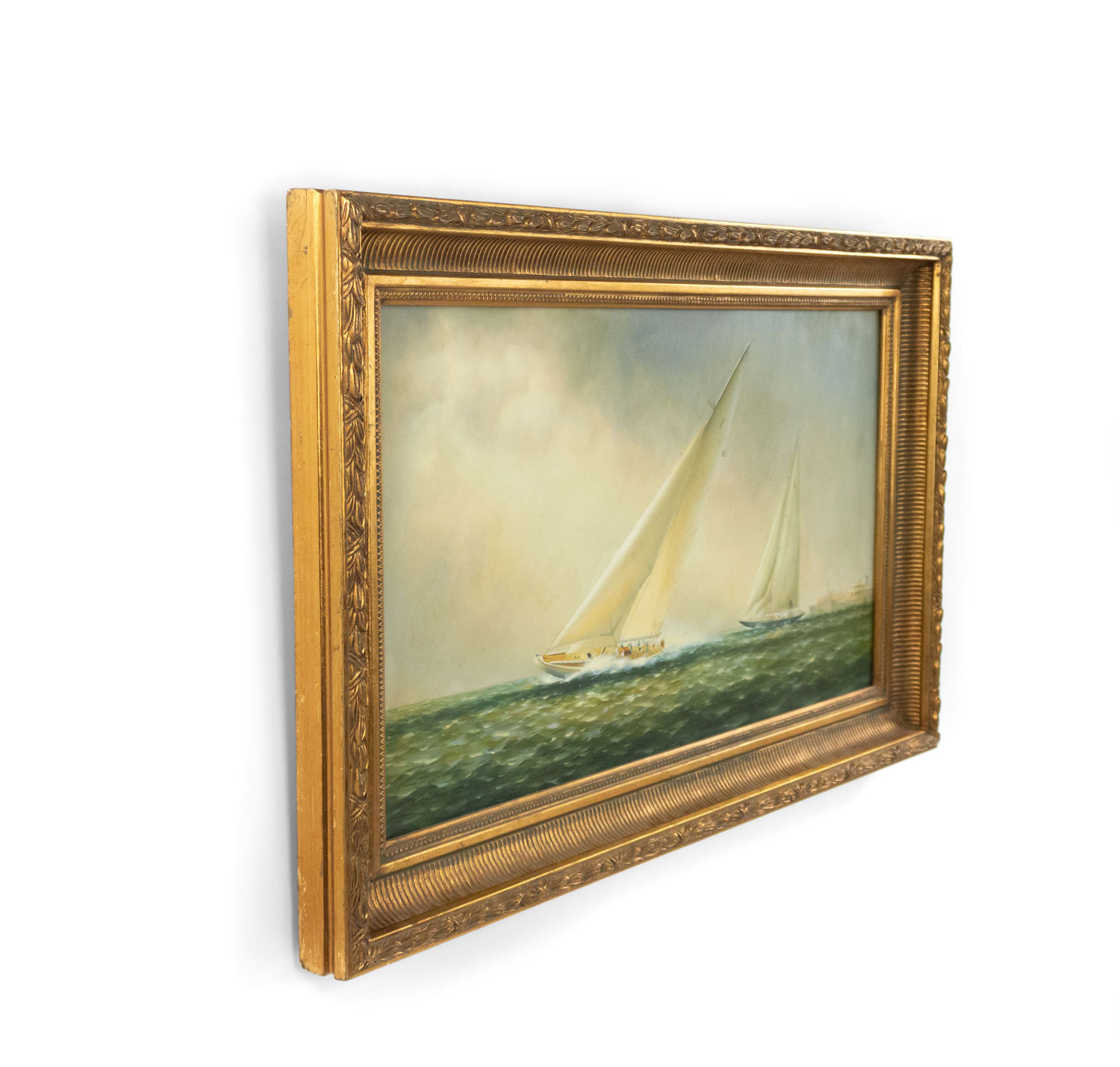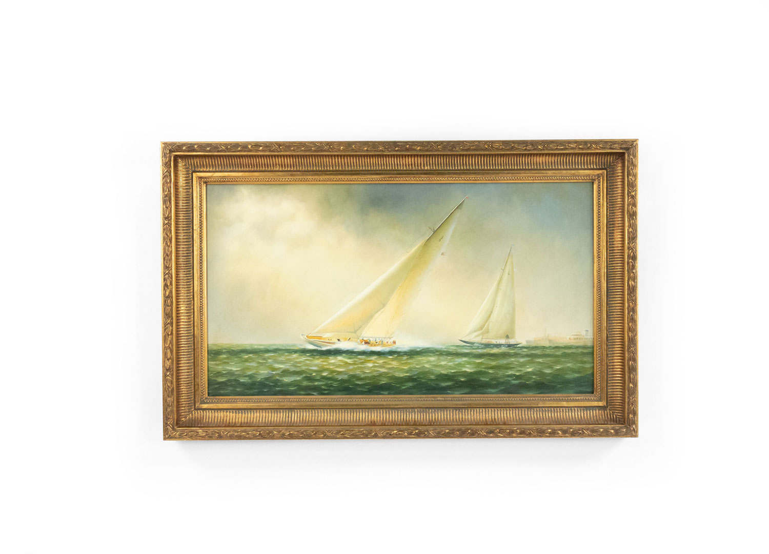 American Victorian style (20th Century) oil painting on canvas depicting a pair of racing sailboats in carved gilt frame..