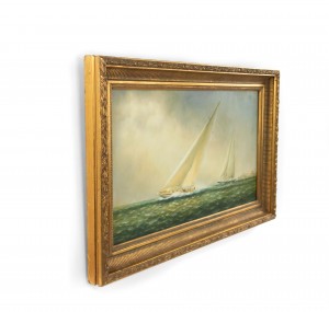 American Victorian style (20th Century) oil painting on canvas depicting a pair of racing sailboats in carved gilt frame.
