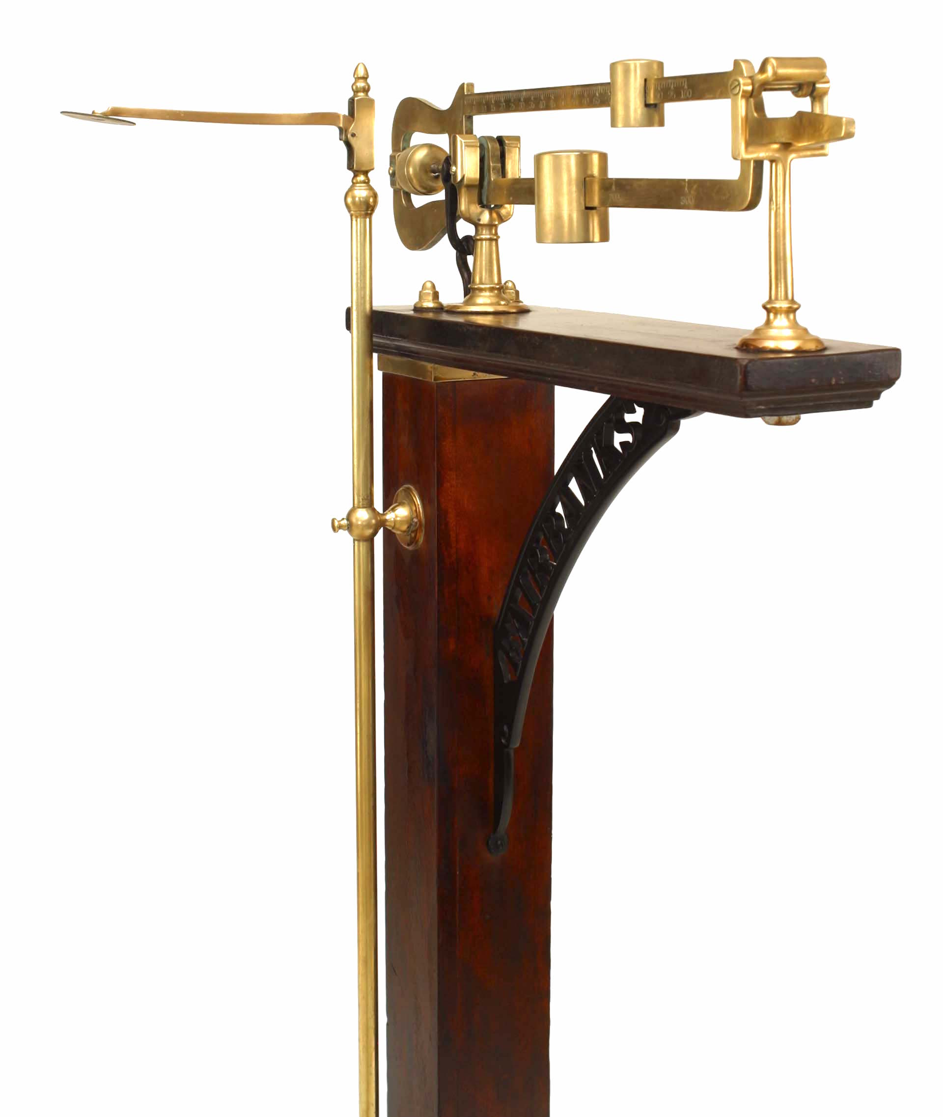 American Victorian standing scale with mahogany center post and brass weight and height measure with platform base on wheels (signed FAIRBANKS).