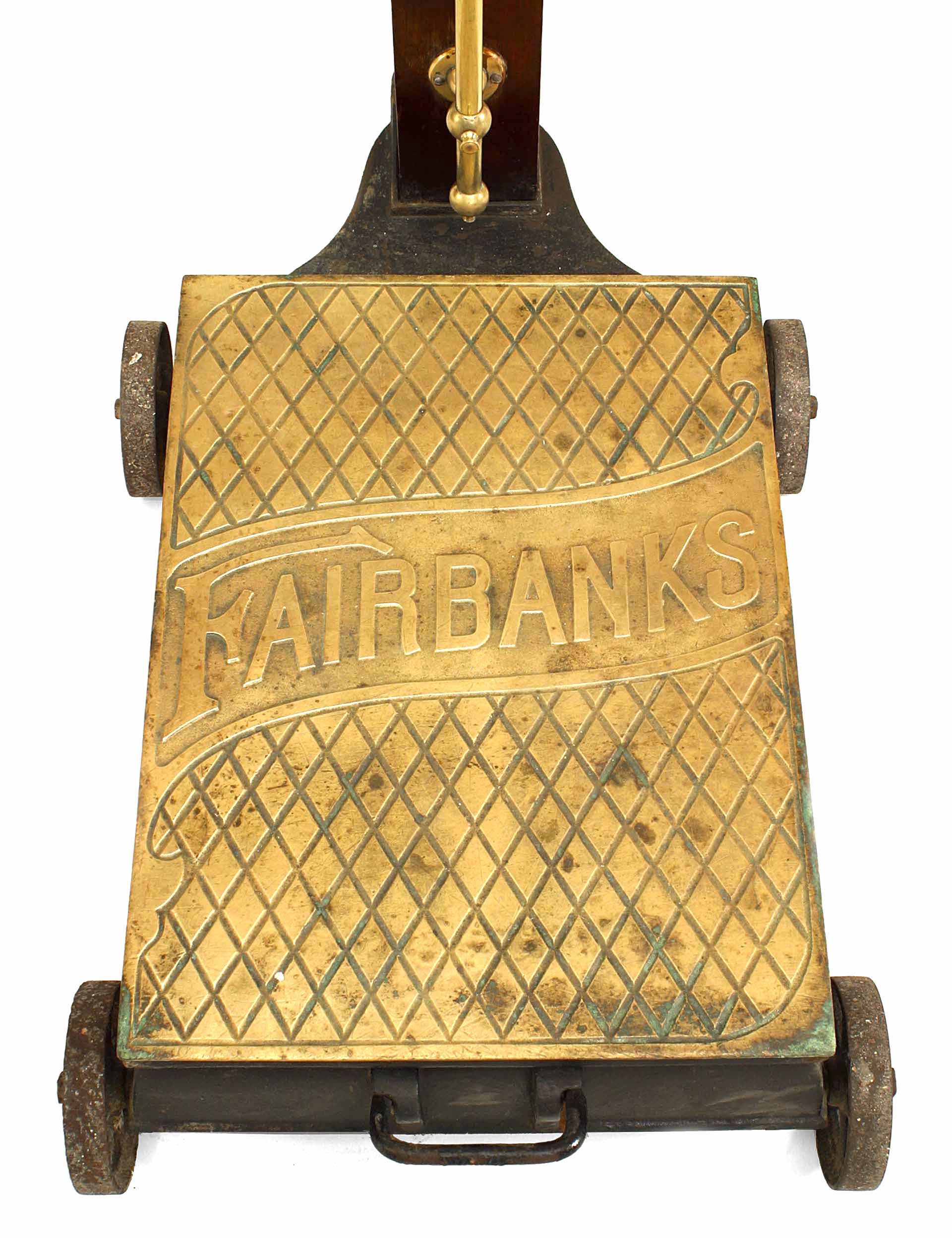 American Victorian standing scale with mahogany center post and brass weight and height measure with platform base on wheels (signed FAIRBANKS)