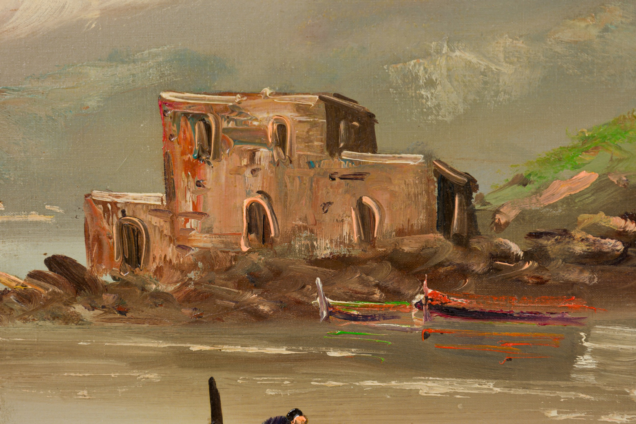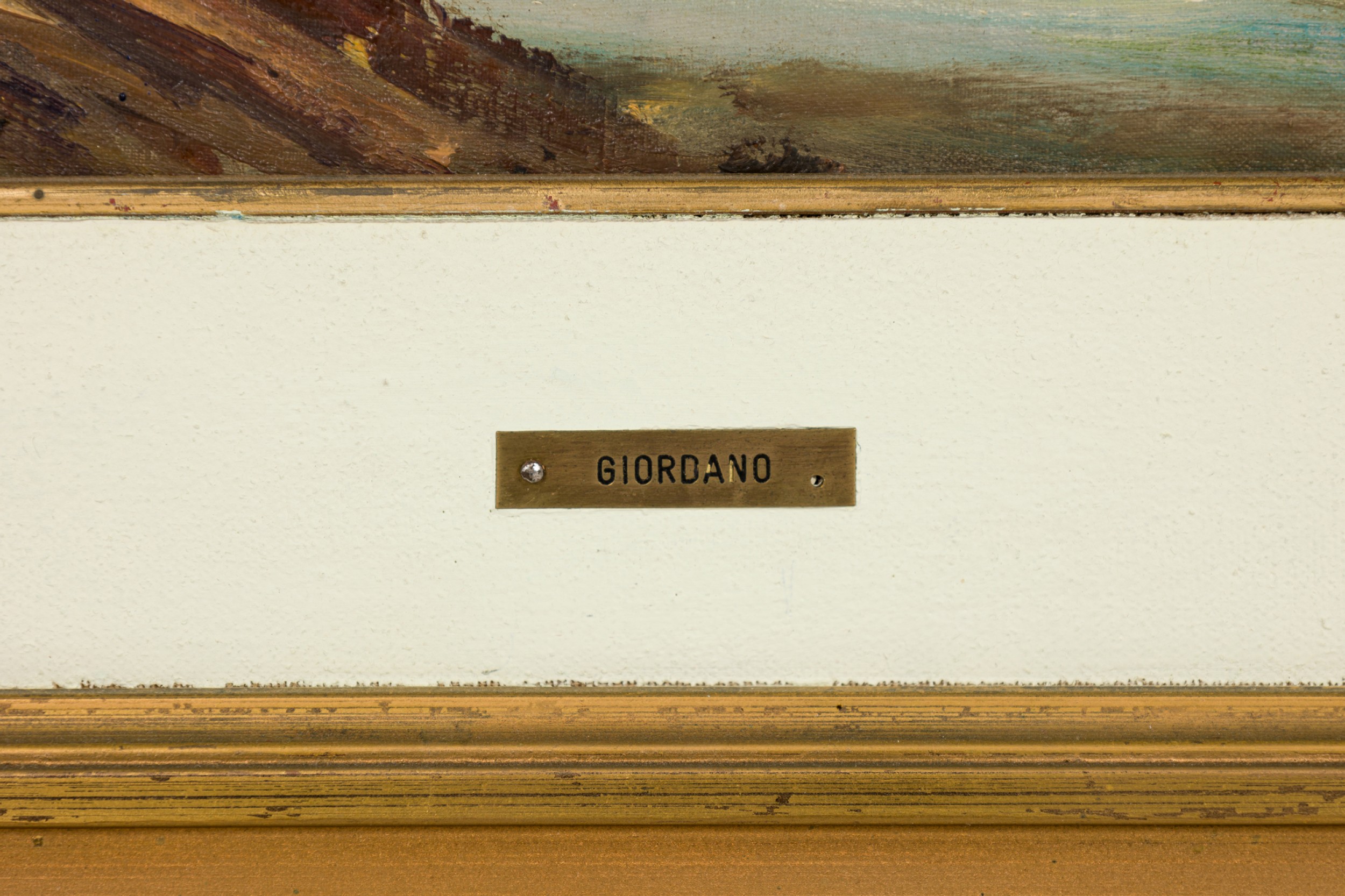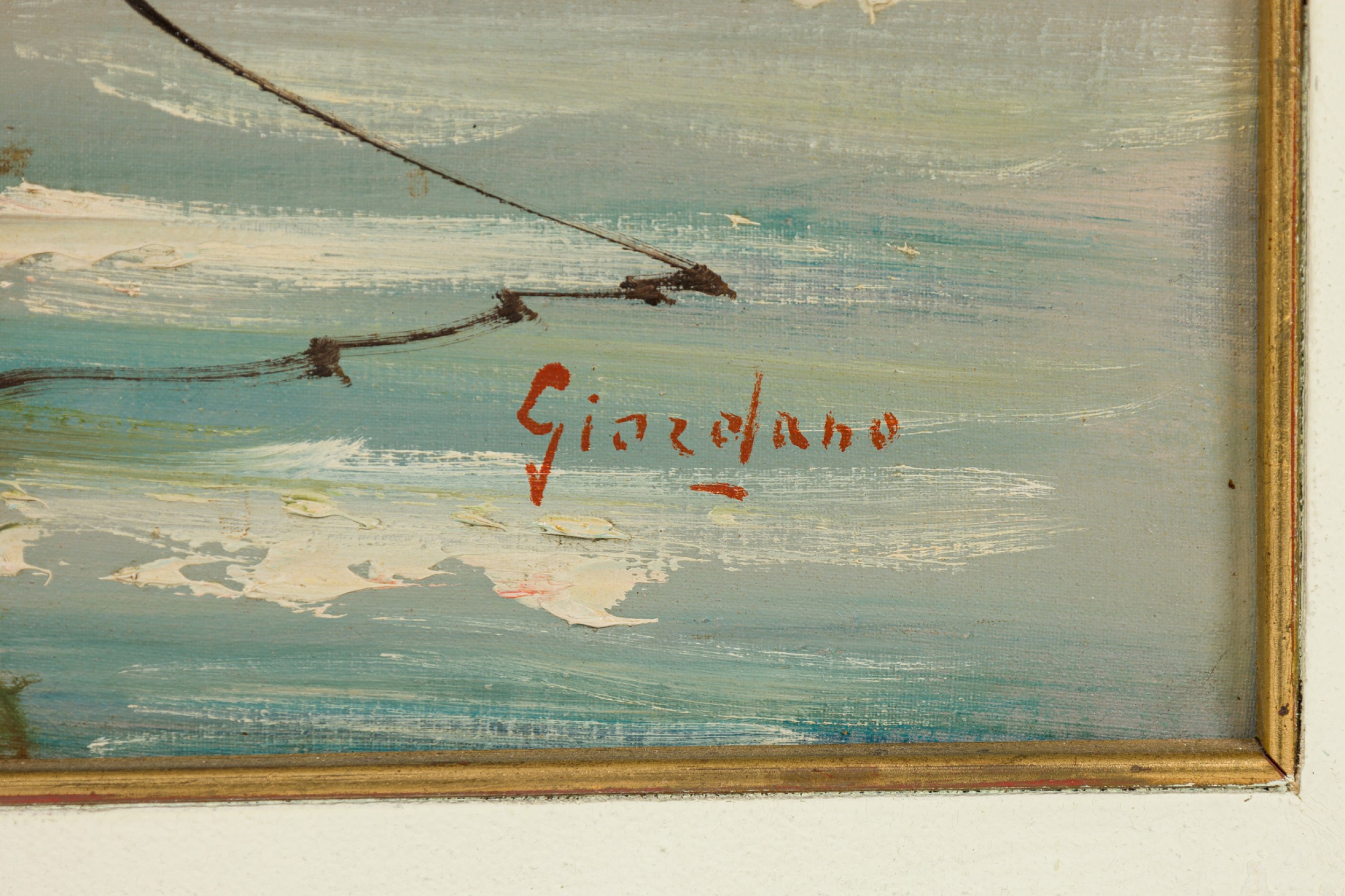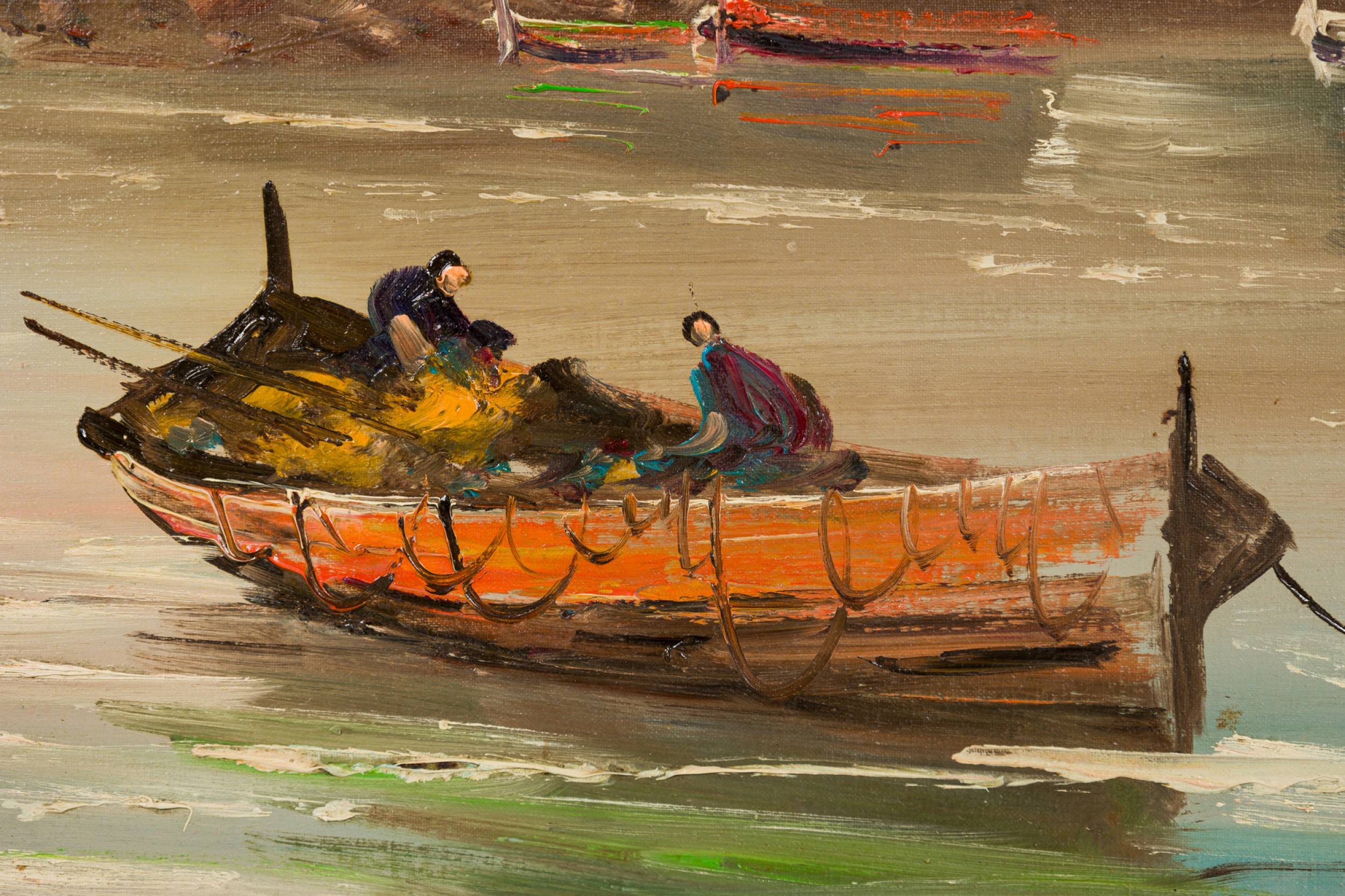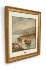 American Mid-Century Seascape Painting of Two Row Boats in a Lake with a building in the background in a gold frame (signed: GIORDANO)