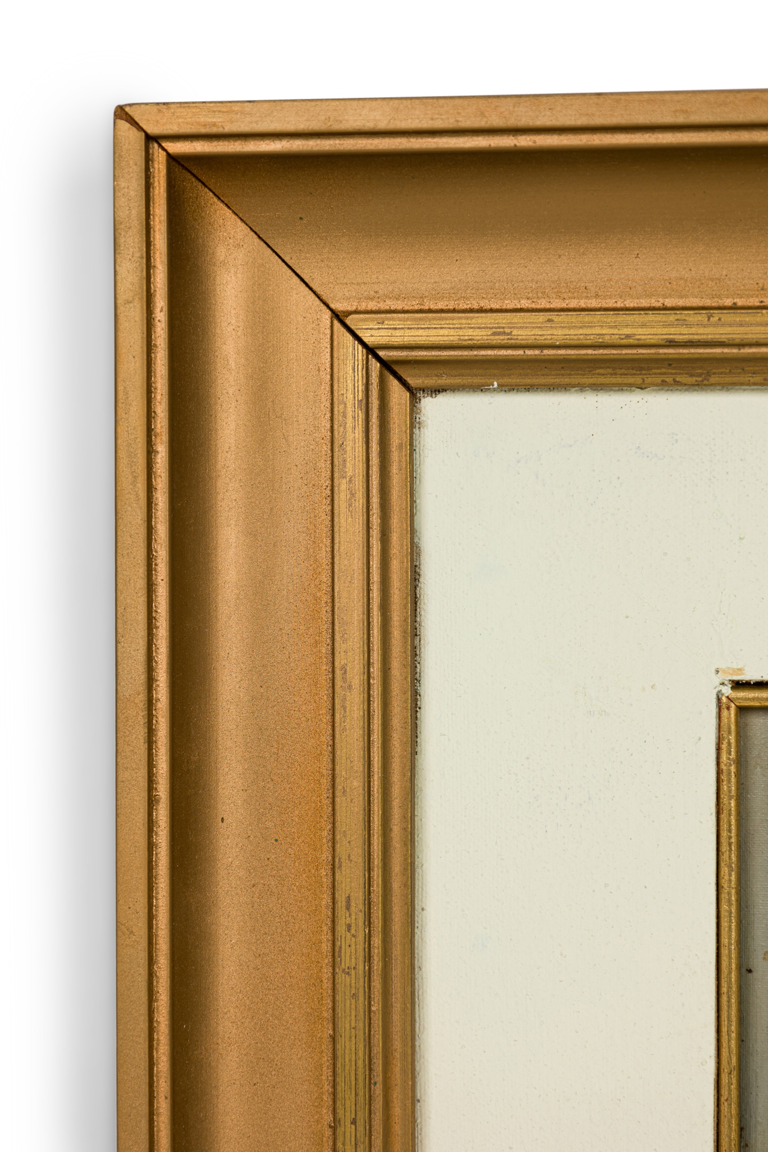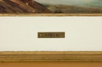 American Mid-Century Seascape Painting of Two Row Boats in a Lake with a building in the background in a gold frame (signed: GIORDANO).