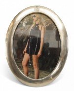 American Victorian-style oval shaped sterling silver easel picture frame with engraved motif at top..