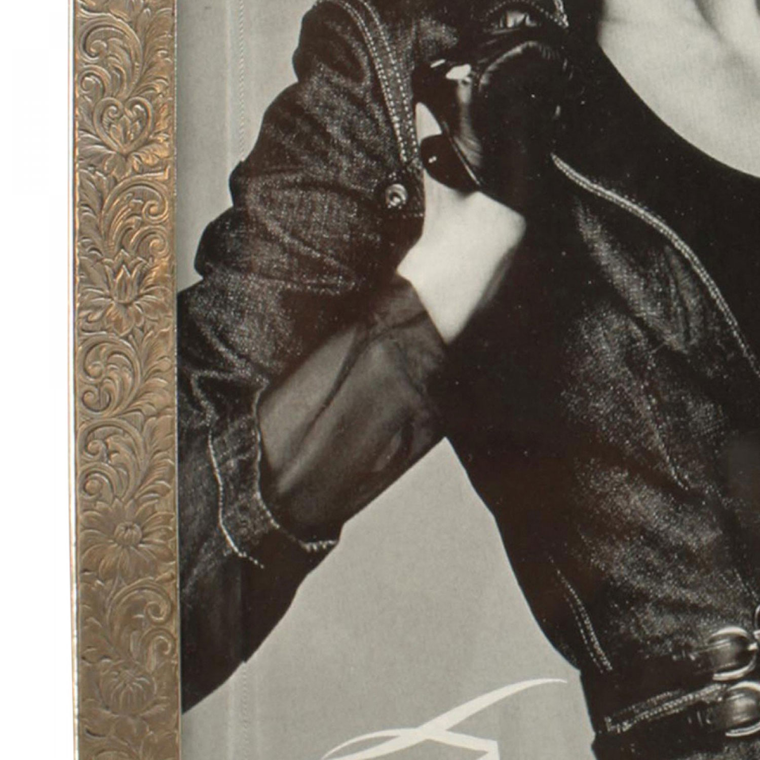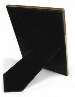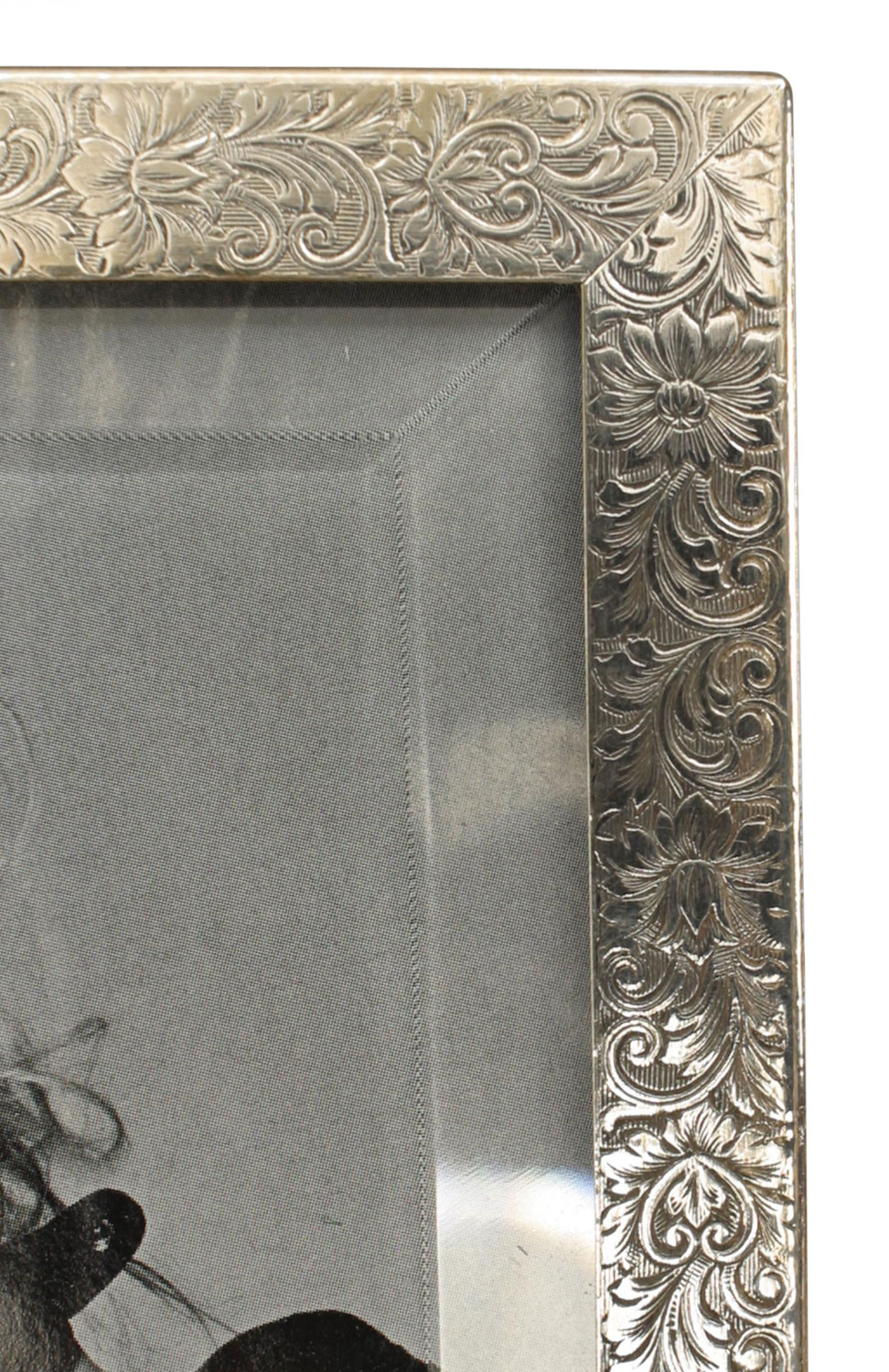 American Victorian-style sterling silver rectangular easel picture frame with etched floral and scroll design and bevelled glass with dark green velvet backing (marked: GERMAN SILVER)
