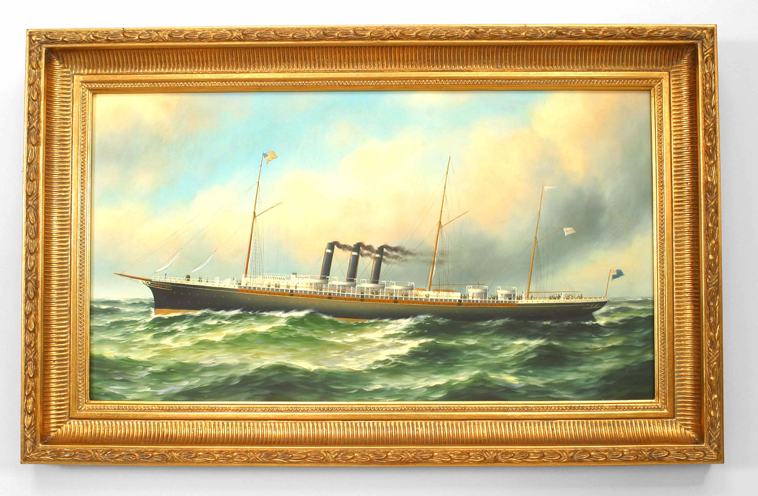 American Victorian style (20th Century) oil painting on canvas depicting a black steamship with American flag in carved gilt frame.