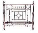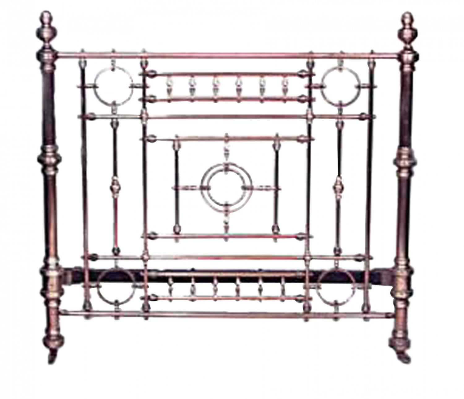 American Victorian-style brass full size bed of open spindle design and celadon colored button upholstered (includes: headboard, footboard, rails).