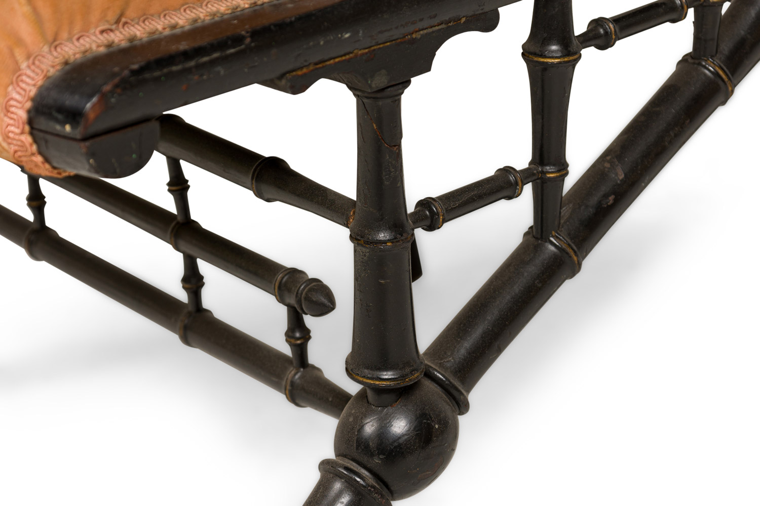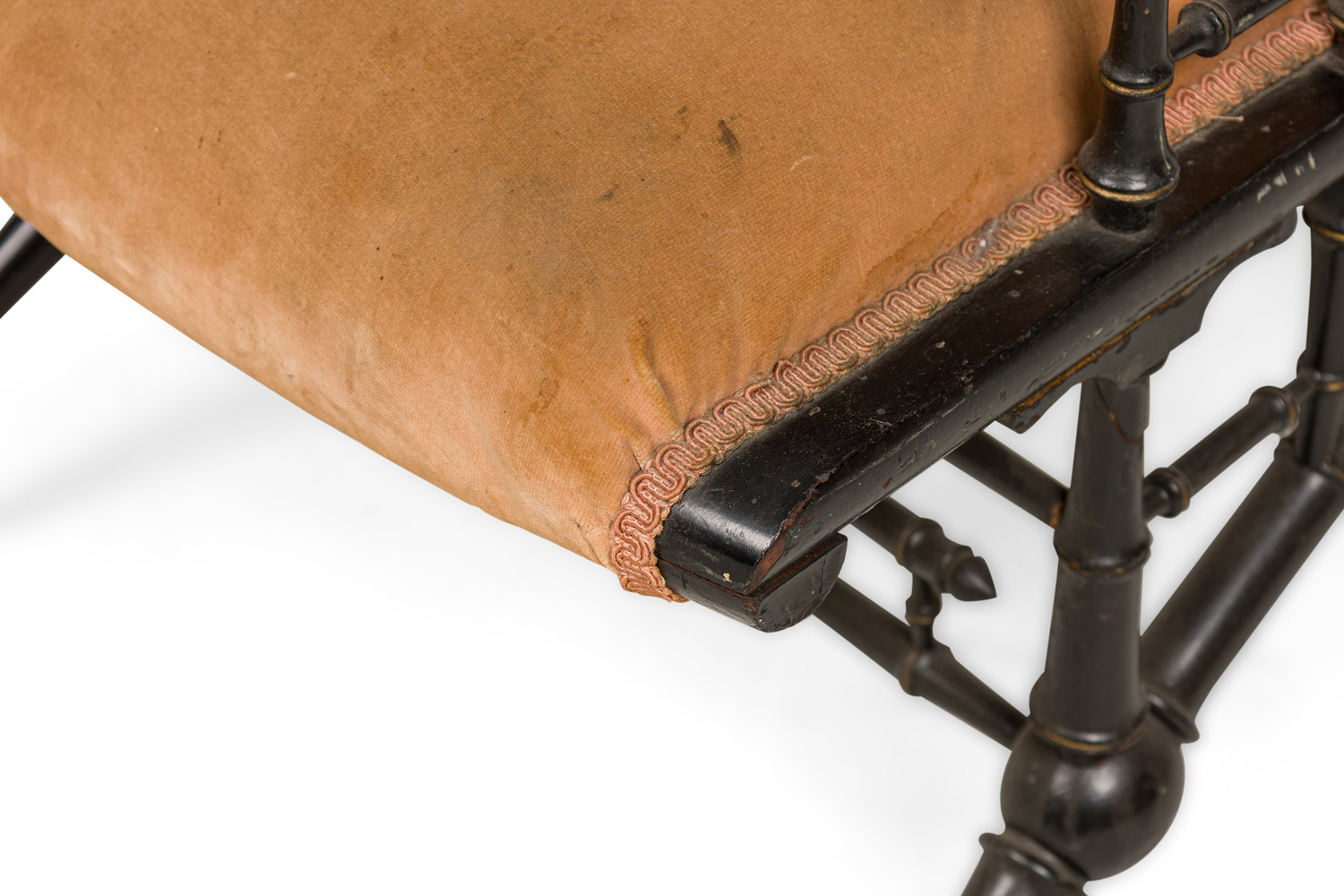 American Victorian ebonized and gilt trimmed arm chair with faux bamboo design and peach velvet upholstery..