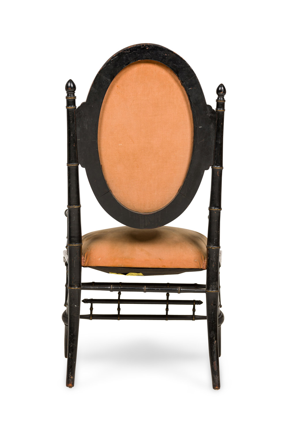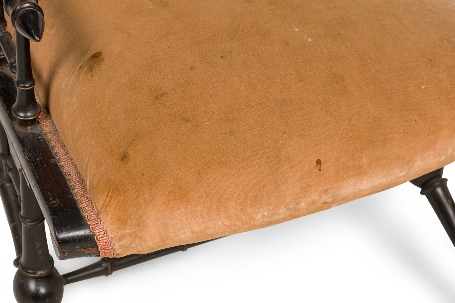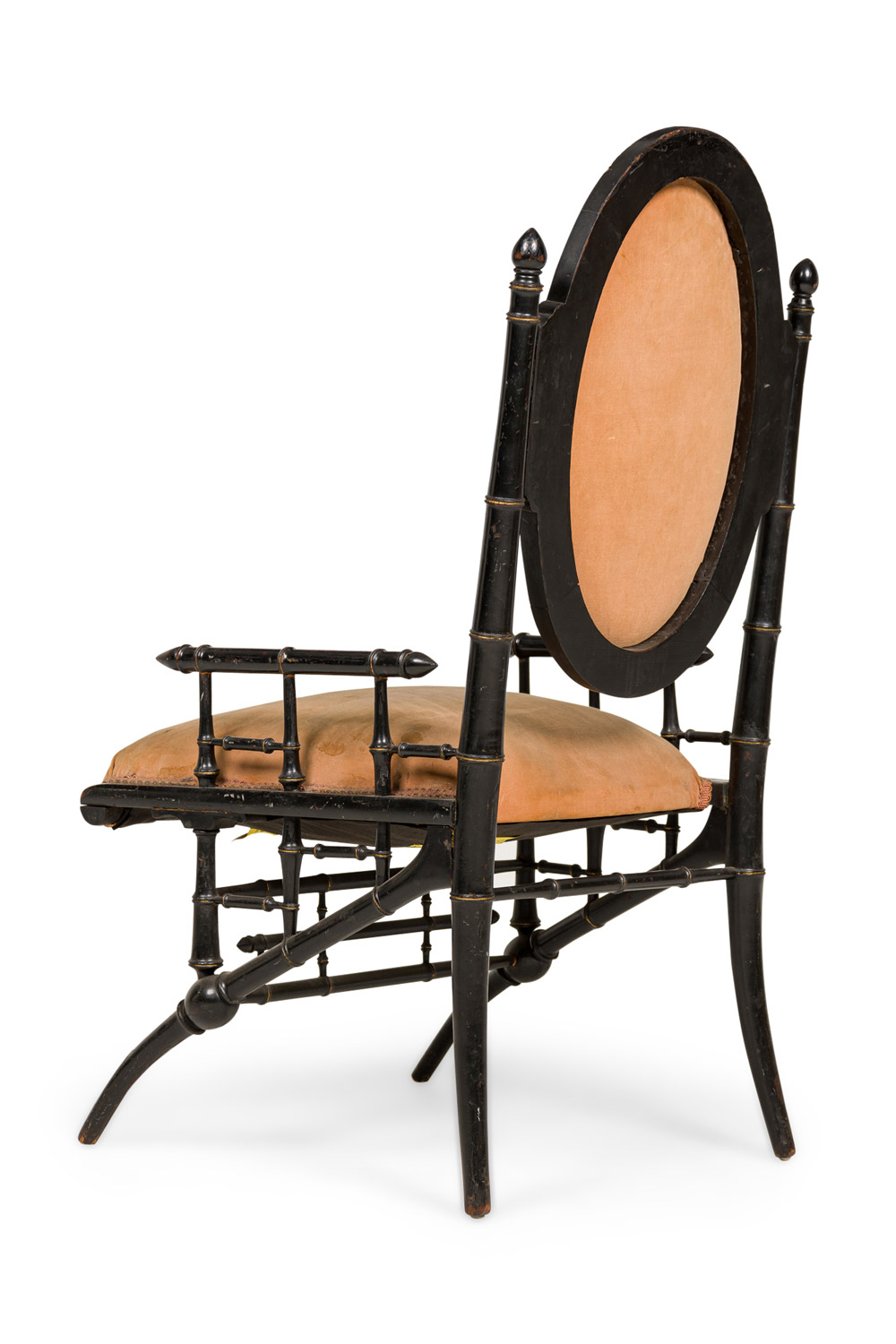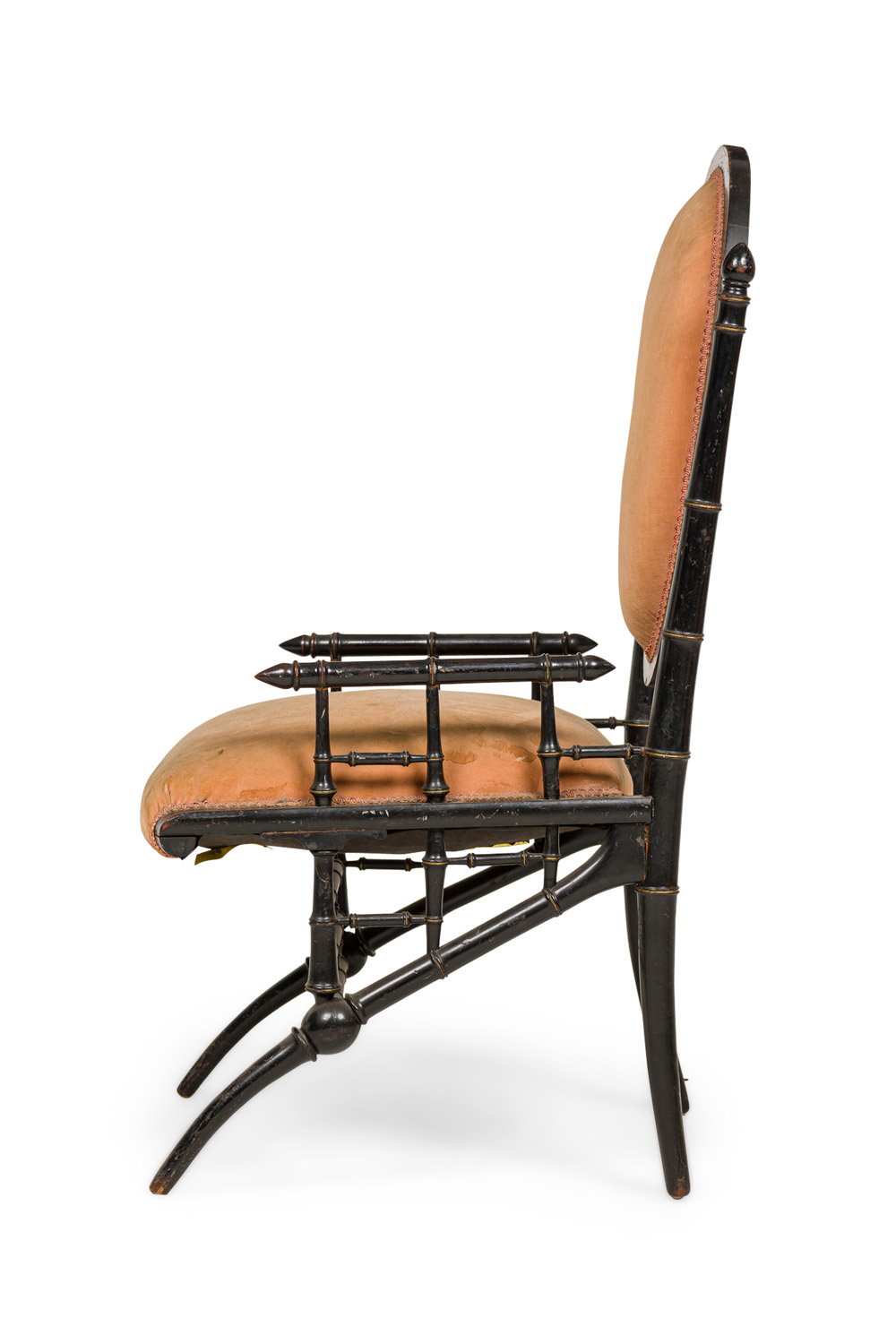 American Victorian ebonized and gilt trimmed arm chair with faux bamboo design and peach velvet upholstery.