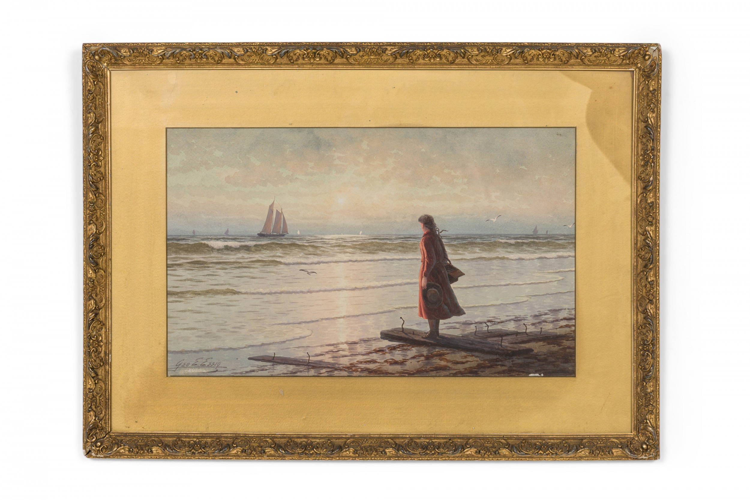 American Victorian 19th Cent watercolor of girl wearing red dress on shore with boats in background in gilt frame (signed George Essing)