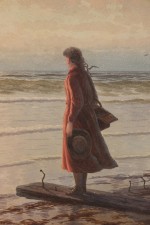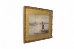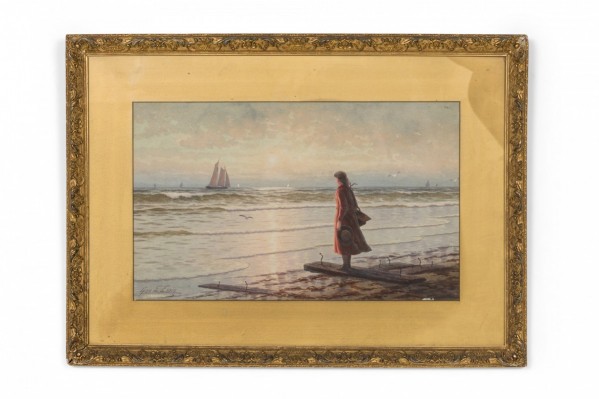 American Victorian 19th Cent watercolor of girl wearing red dress on shore with boats in background in gilt frame (signed George Essing).
