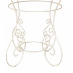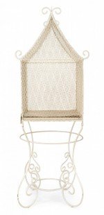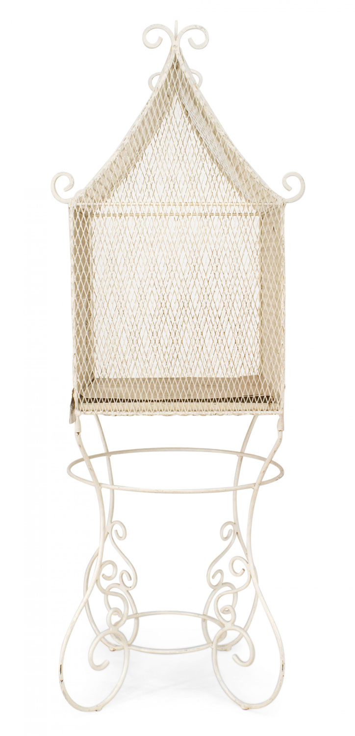 American Victorian white painted bird cage with finials on iron scroll base.