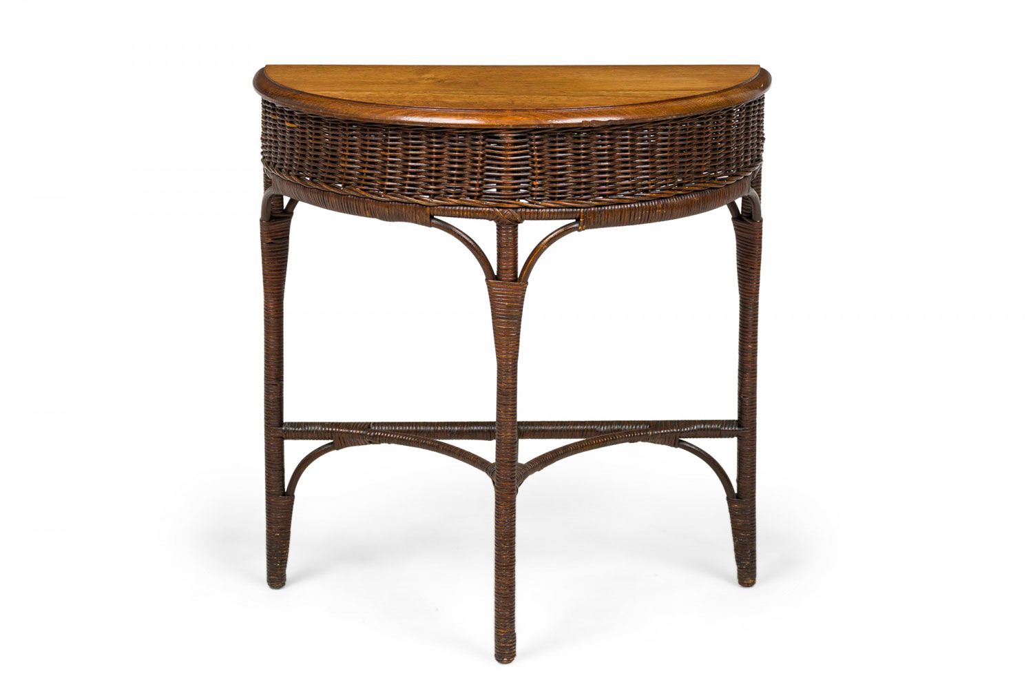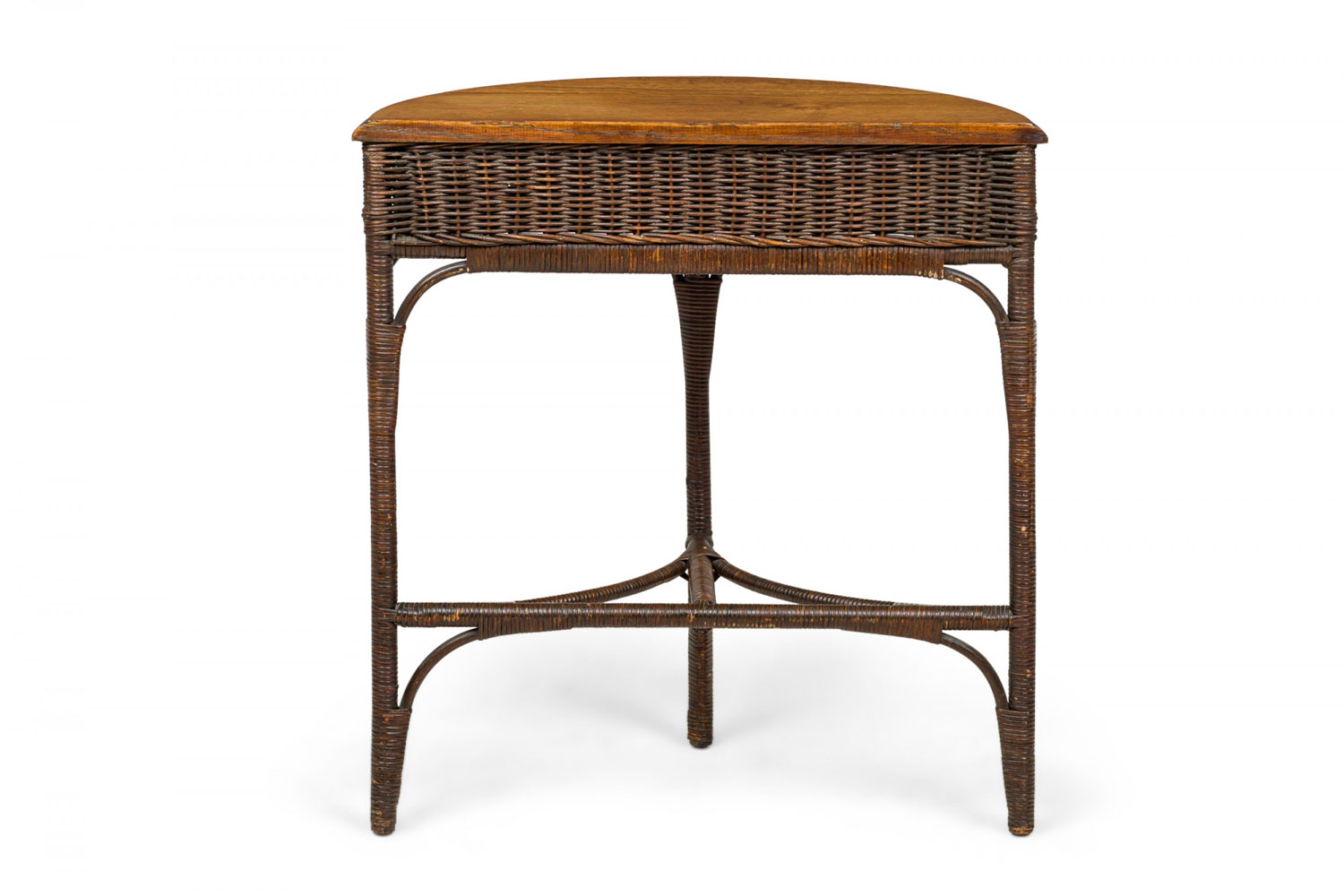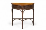 American Victorian Wicker and Oak Topped Demilune 3-Legged Console Table