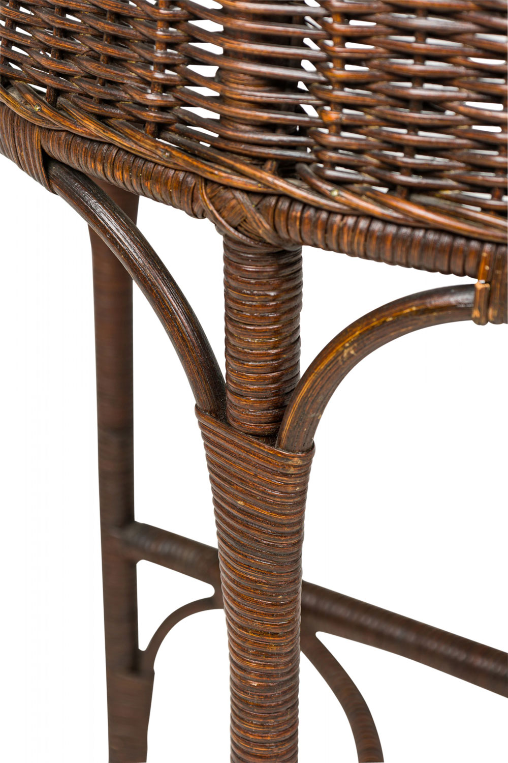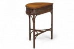 American Victorian Wicker and oak topped demilune side table with beveled top edge and wicker apron, resting on 3 wicker-wrapped legs, with curved wood supports and a T-shaped stretcher base.