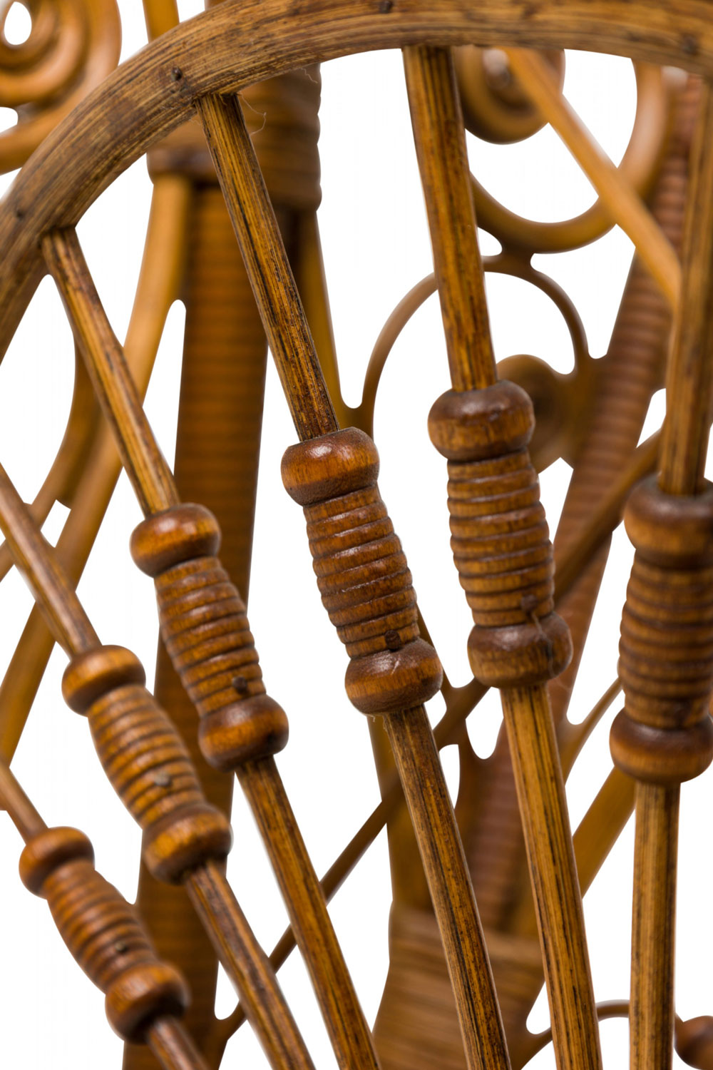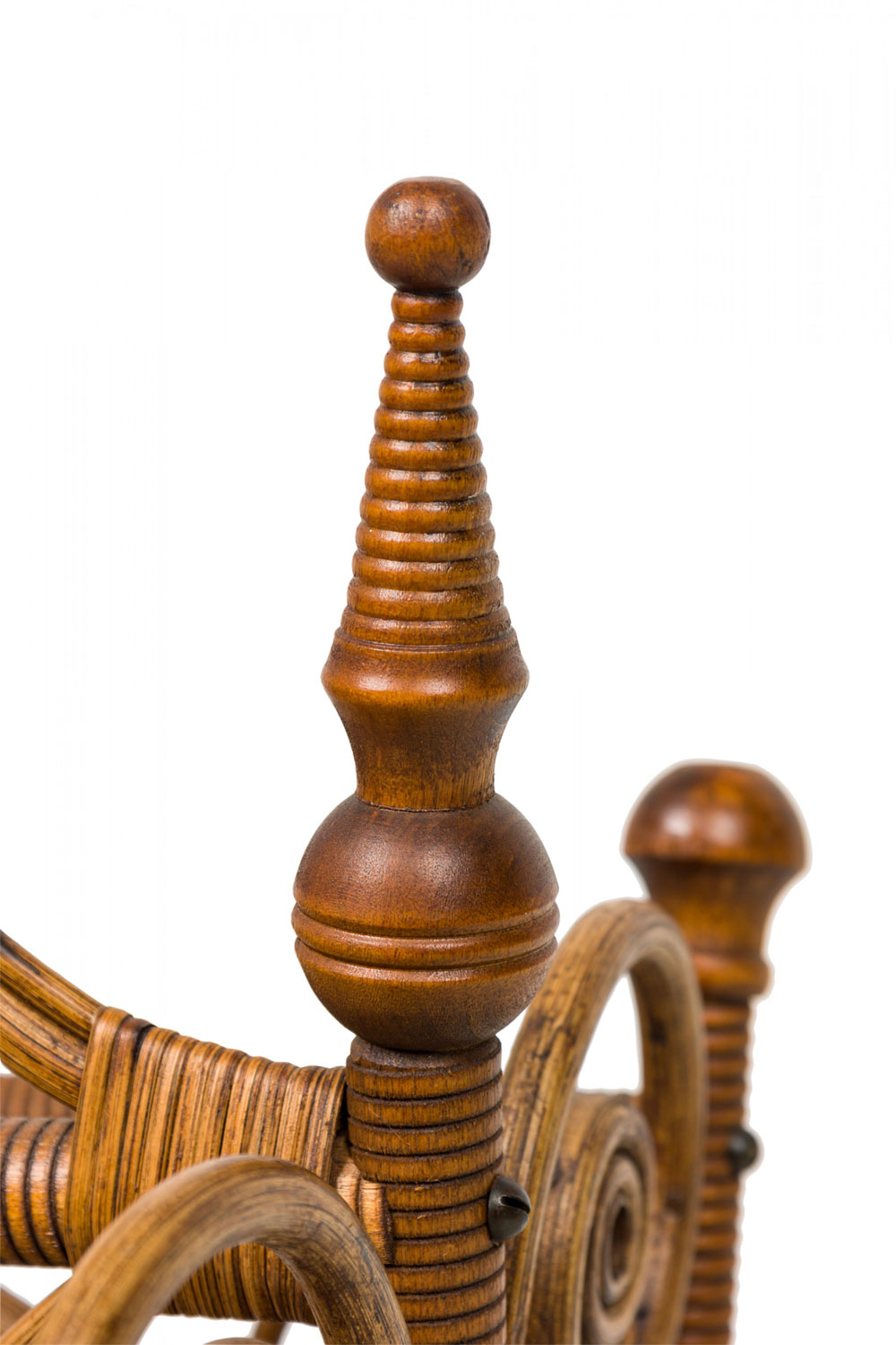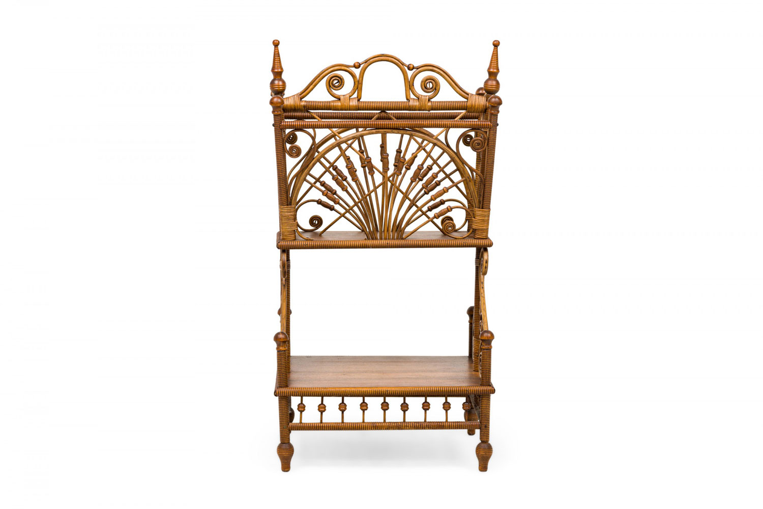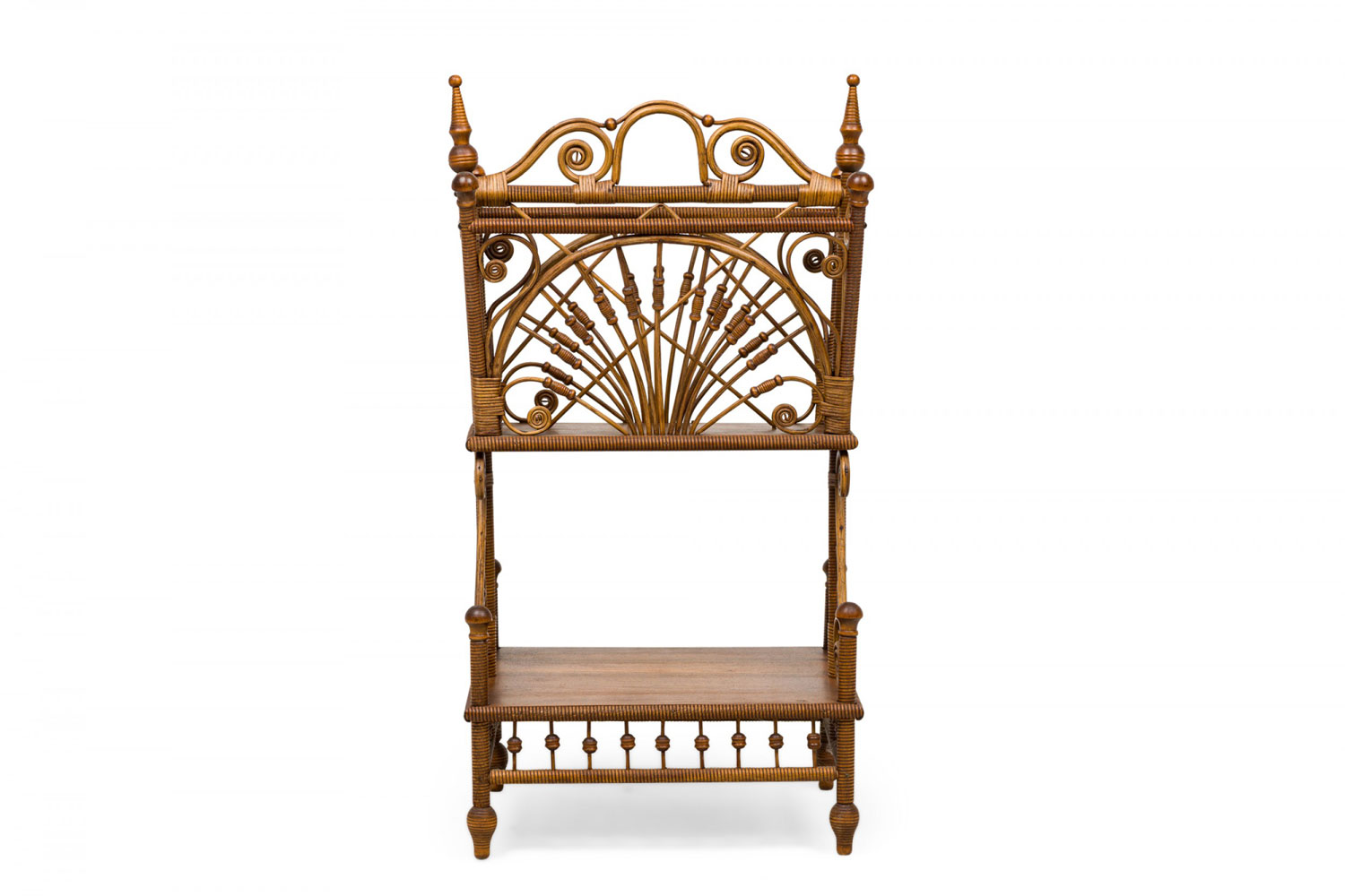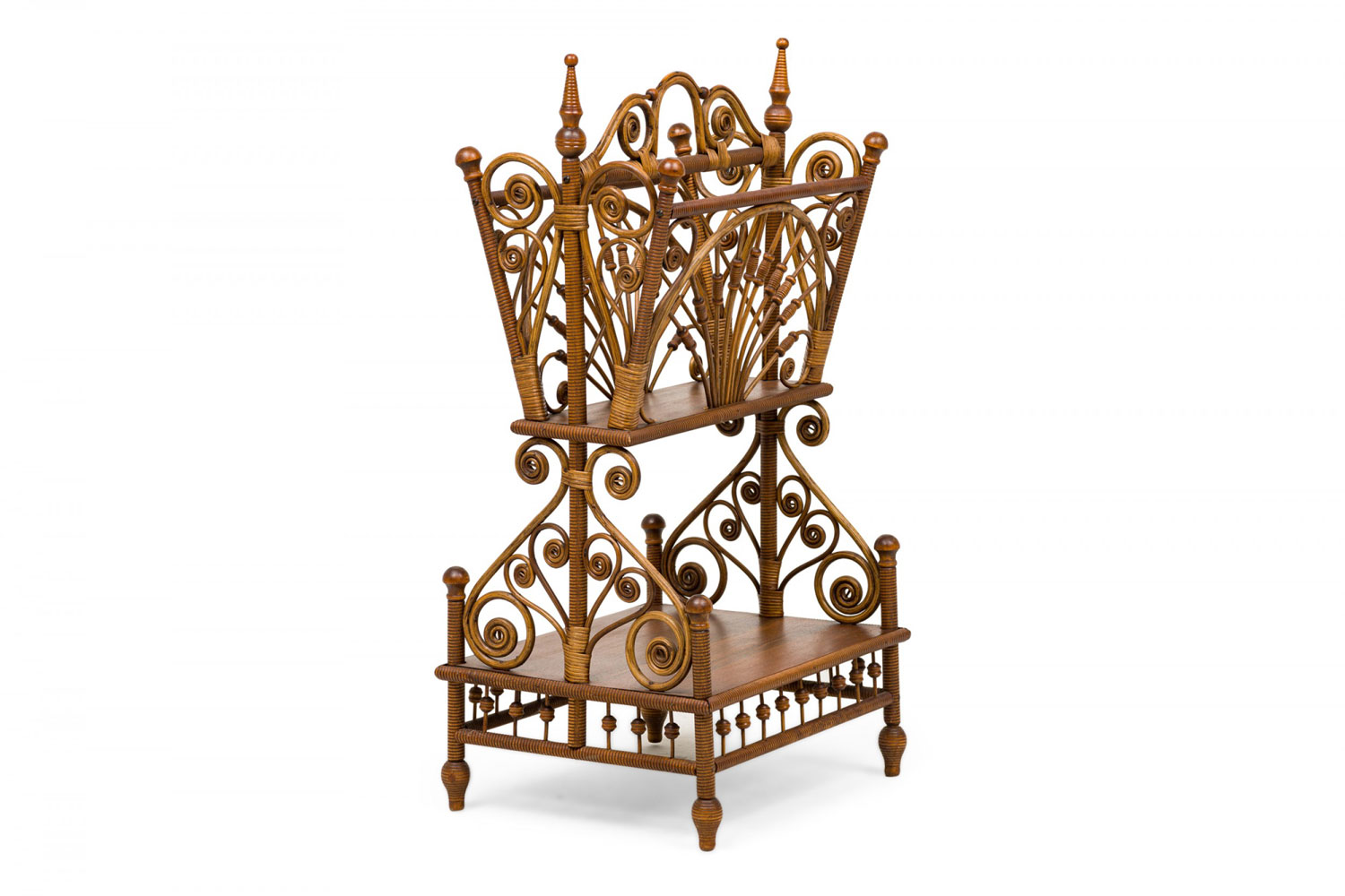 American Victorian Wicker and wood 2-tiered magazine stand with a rectangular stretcher shelf, with openwork decorative scroll motif and turned finials and feet. (att: HEYWOOD WAKEFIELD)