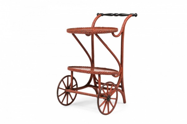 American Victorian black painted wicker bar cart with 2 large front wheels supporting a shelf with gallery and a tray top with handles above a woven apron.