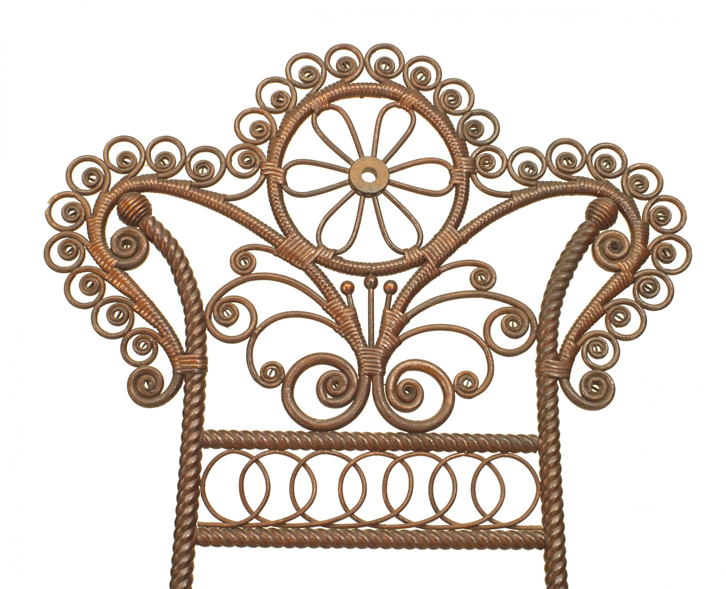 American Victorian dark stained natural wicker & spool wood easel stand with shaped and scroll pediment top and bottom with a pair of iron filigree supports. (att: HEYWOOD WAKEFIELD)