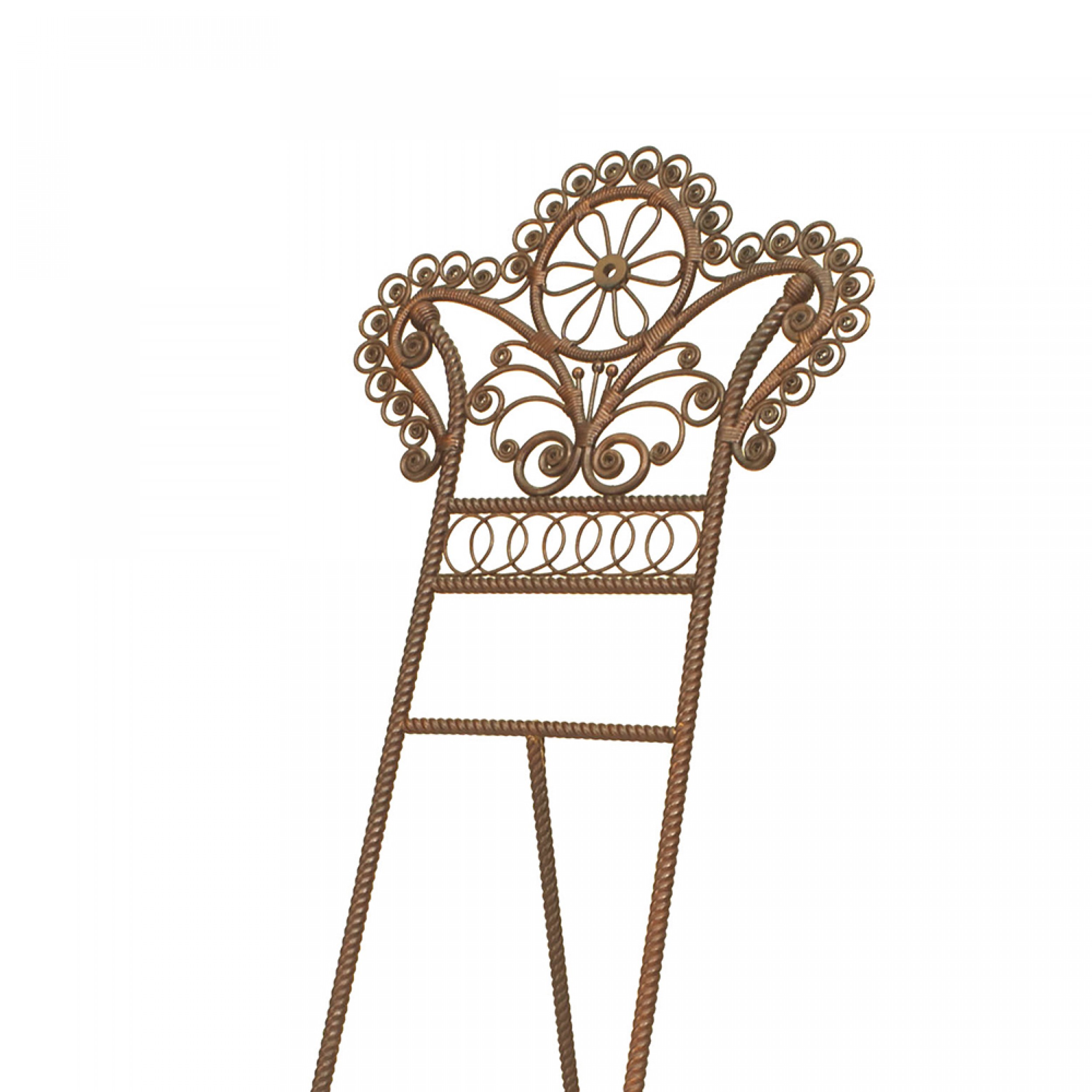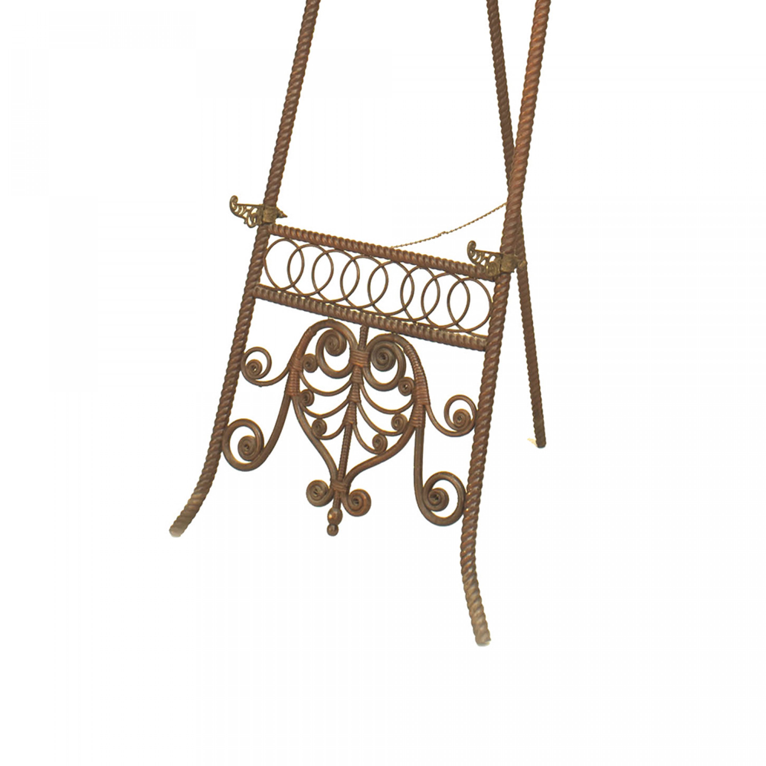 American Victorian dark stained natural wicker & spool wood easel stand with shaped and scroll pediment top and bottom with a pair of iron filigree supports. (att: HEYWOOD WAKEFIELD).