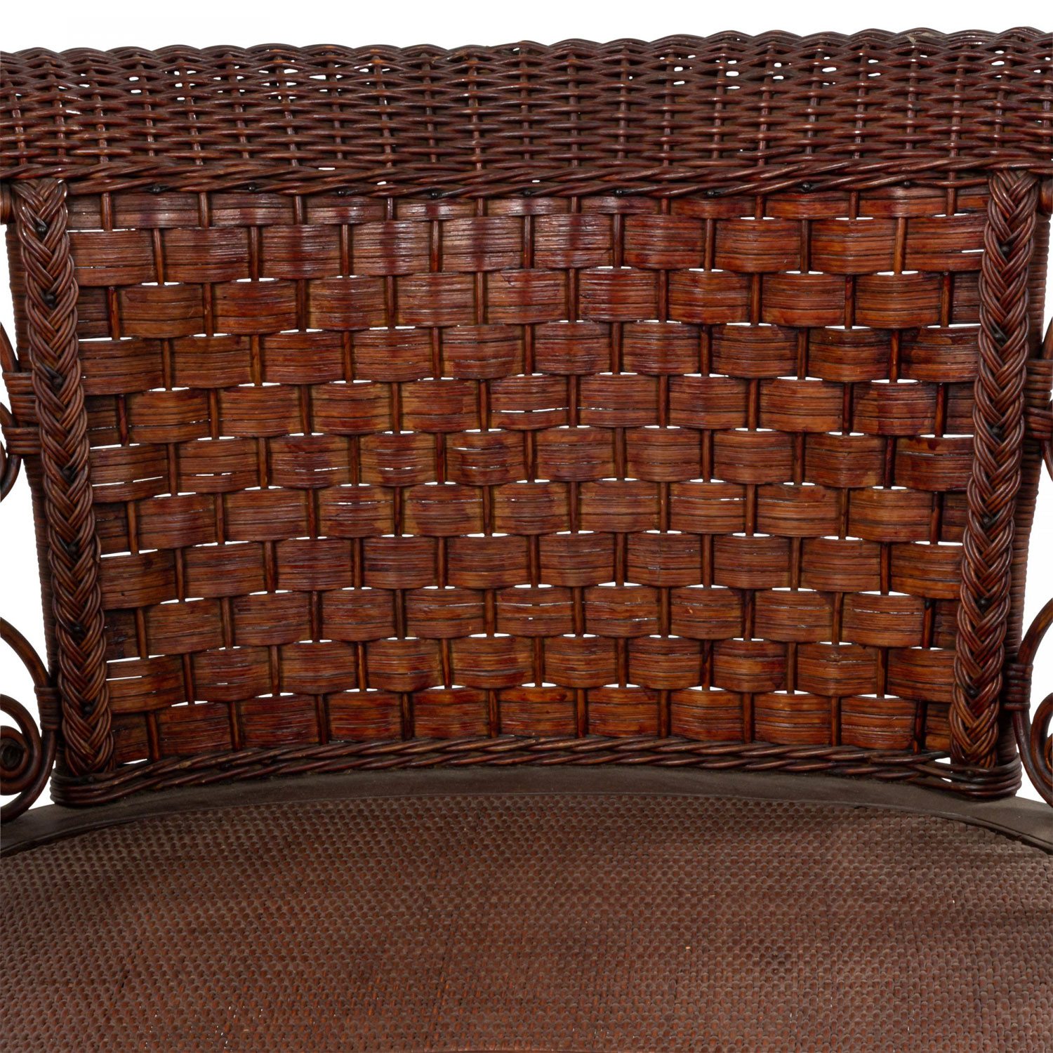 American Victorian dark natural wicker small loveseat with continuous roll arm back and woven apron & back panel with kidney shaped seat. (att: HEYWOOD WAKEFIELD).