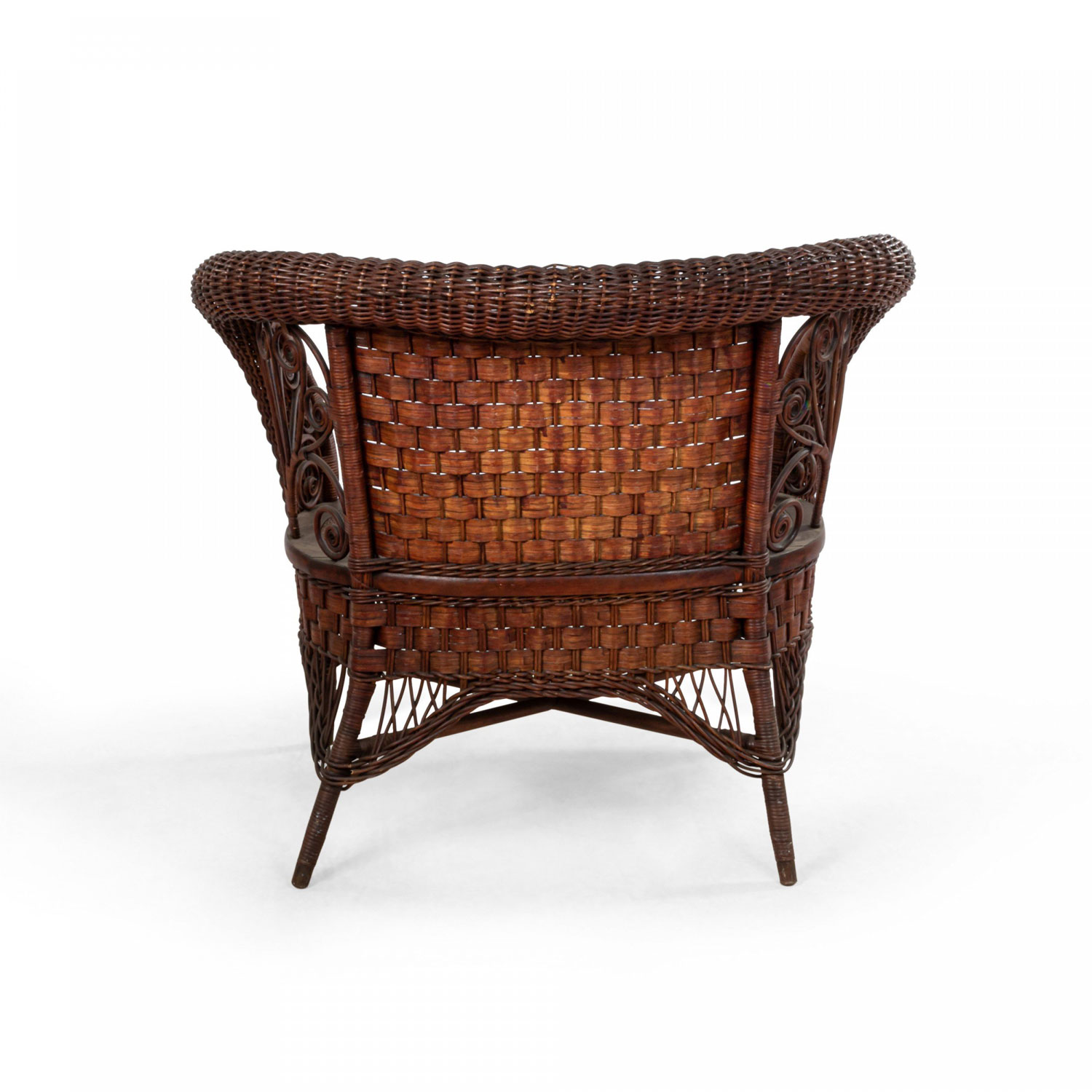American Victorian dark natural wicker small loveseat with continuous roll arm back and woven apron & back panel with kidney shaped seat. (att: HEYWOOD WAKEFIELD)