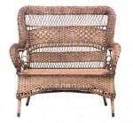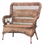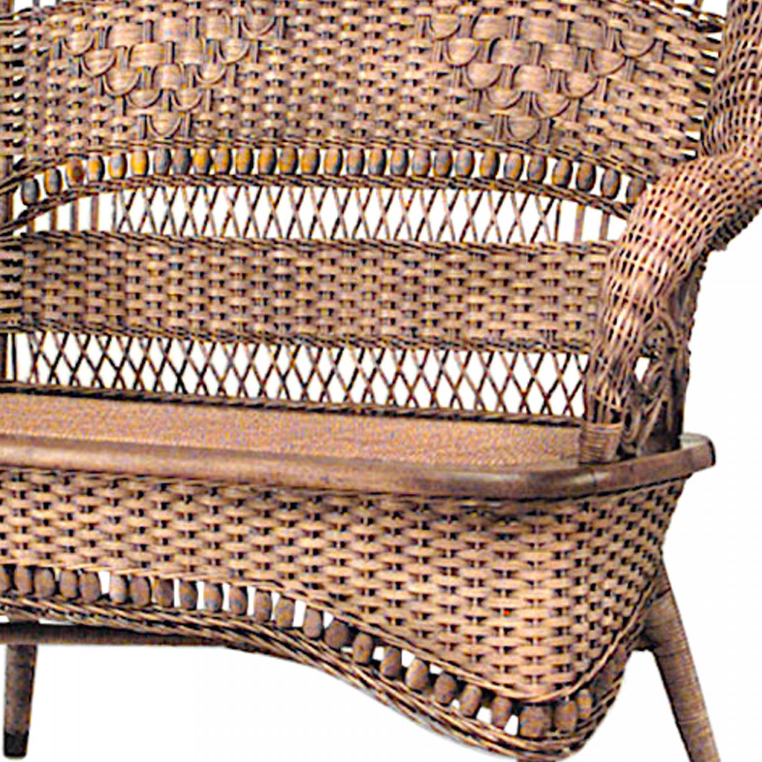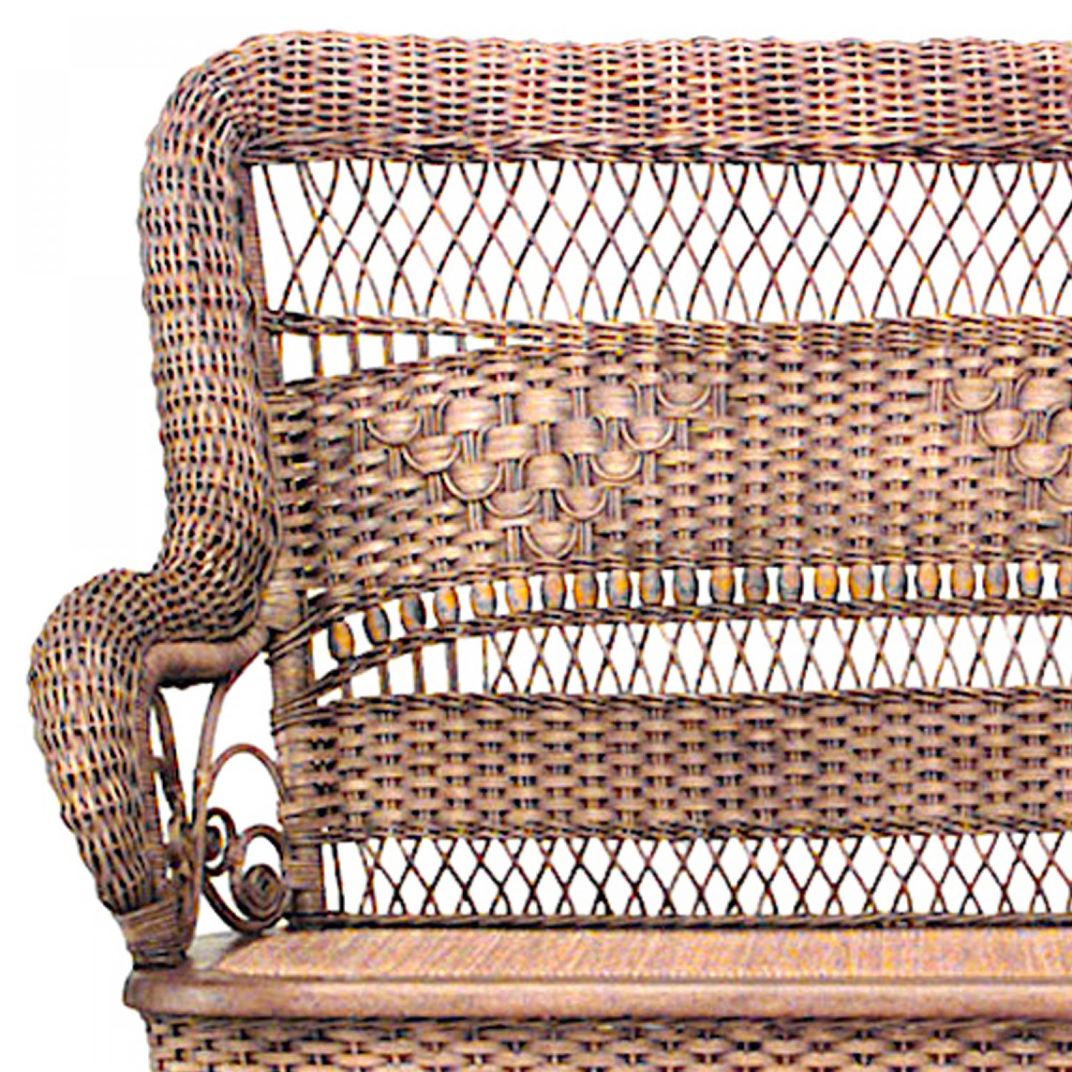 American Victorian natural wicker woven roll design high back loveseat with spindles and bobbins on back and apron. (LARKIN & CO. label)